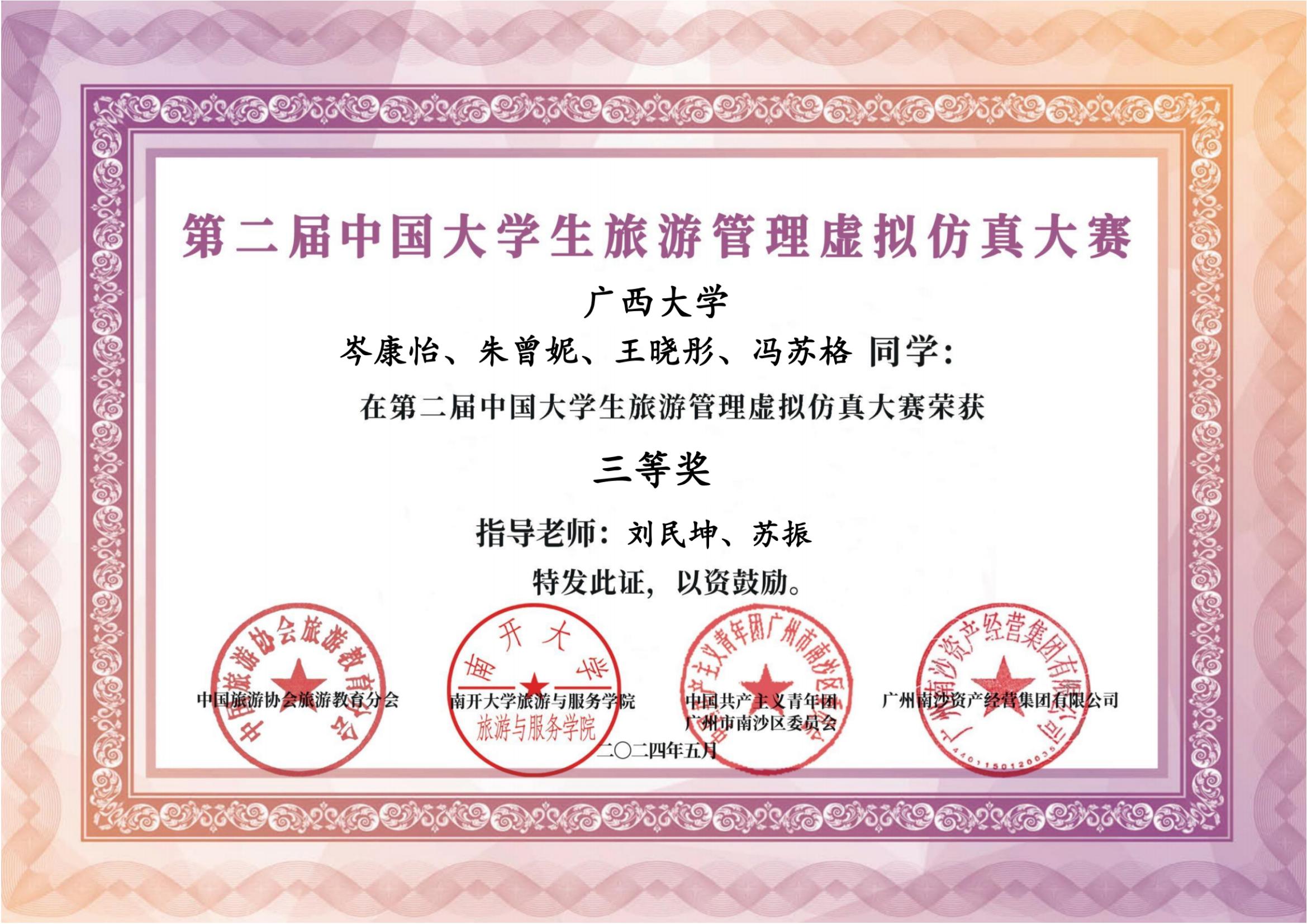 旅游管理专业2023级本科生(岑康怡,朱曾妮,冯苏格,王晓彤)组成的参赛队伍表现出色,荣获大赛三等奖。