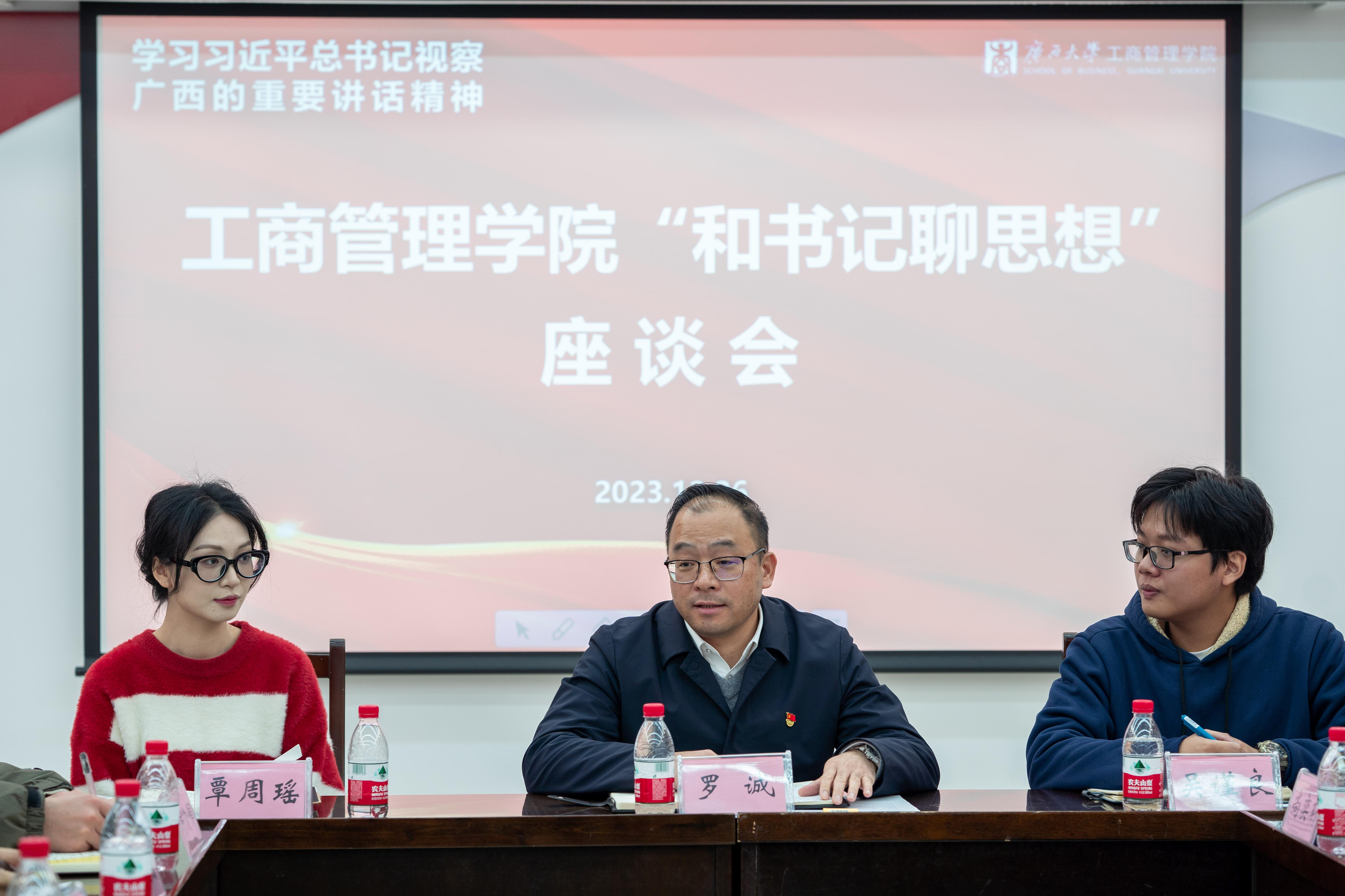 罗诚书记耐心倾听学生代表们的发言,并一一回应,全方位地了解同学们的心声。他对同学们在担任学生干部期间的工作给予肯定,他表示,同学们在工作中不断成长,有责任有担当,有敏锐的问题意识,他鼓励大家多发现问题,多思考如何解决问题,并形成自己的“解题思路”。他还和大家分享了自己学习领会习近平总书记视察广西的重要讲话精神的心得体会,并指出要把学习宣传贯彻习近平总书记视察广西的重要讲话精神作为当前和今后一个时期的重大政治任务,及时跟进学、融会贯通学、联系实际学,从中汲取感恩奋进的智慧和力量。他希望同学们牢记习近平总书记的嘱托,带头解放思想、创新求变,要提高政治高度和全局观,通过转变解决问题的思路解决实际问题;要树立终身学习的理念,不仅要加强理论学习,还要加强专业学习和实践学习;要守住底线红线,严格要求自己,无论是学习、工作还是生活中不打破道德底线,不触碰法律红线;要珍惜时代赋予的机会和平台,时刻保持奋斗的姿态,始终坚定奋斗的步伐,在服务同学的过程中,奋力书写新时代属于自己的华彩篇章;要涵养善于总结的好习惯,在总结中反思自己、超越自我。
