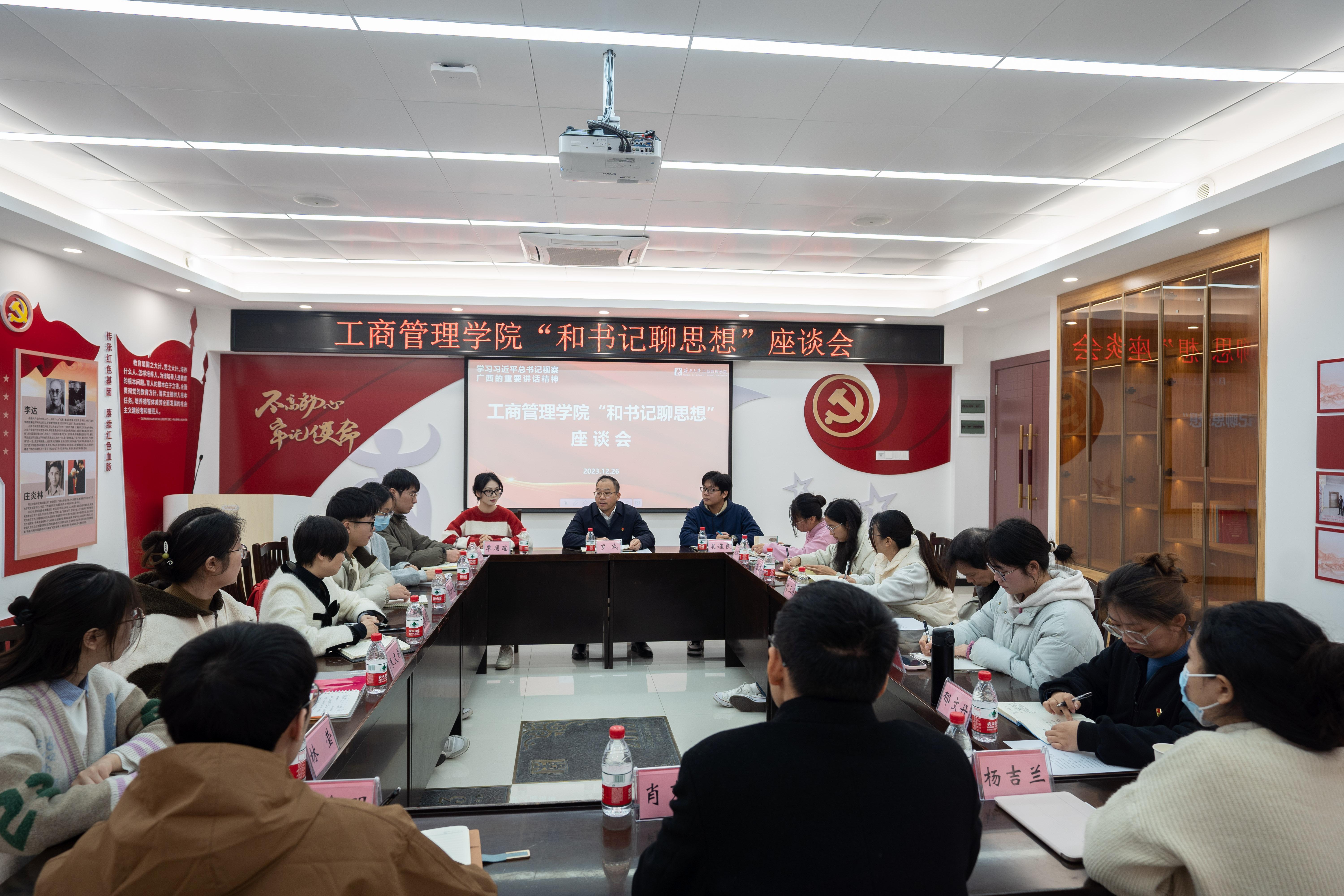 在党员活动室开展“和书记聊思想”活动,深入学习领会习近平总书记视察广西的重要讲话精神。学院党委书记罗诚与13名学生干部代表面对面交流,了解同学们的理论学习感悟、思想动态、日常学习生活等方面情况。学院党委副书记肖克宁、团委书记马丽娟、组织员黄照温、辅导员郁文丹参与活动。