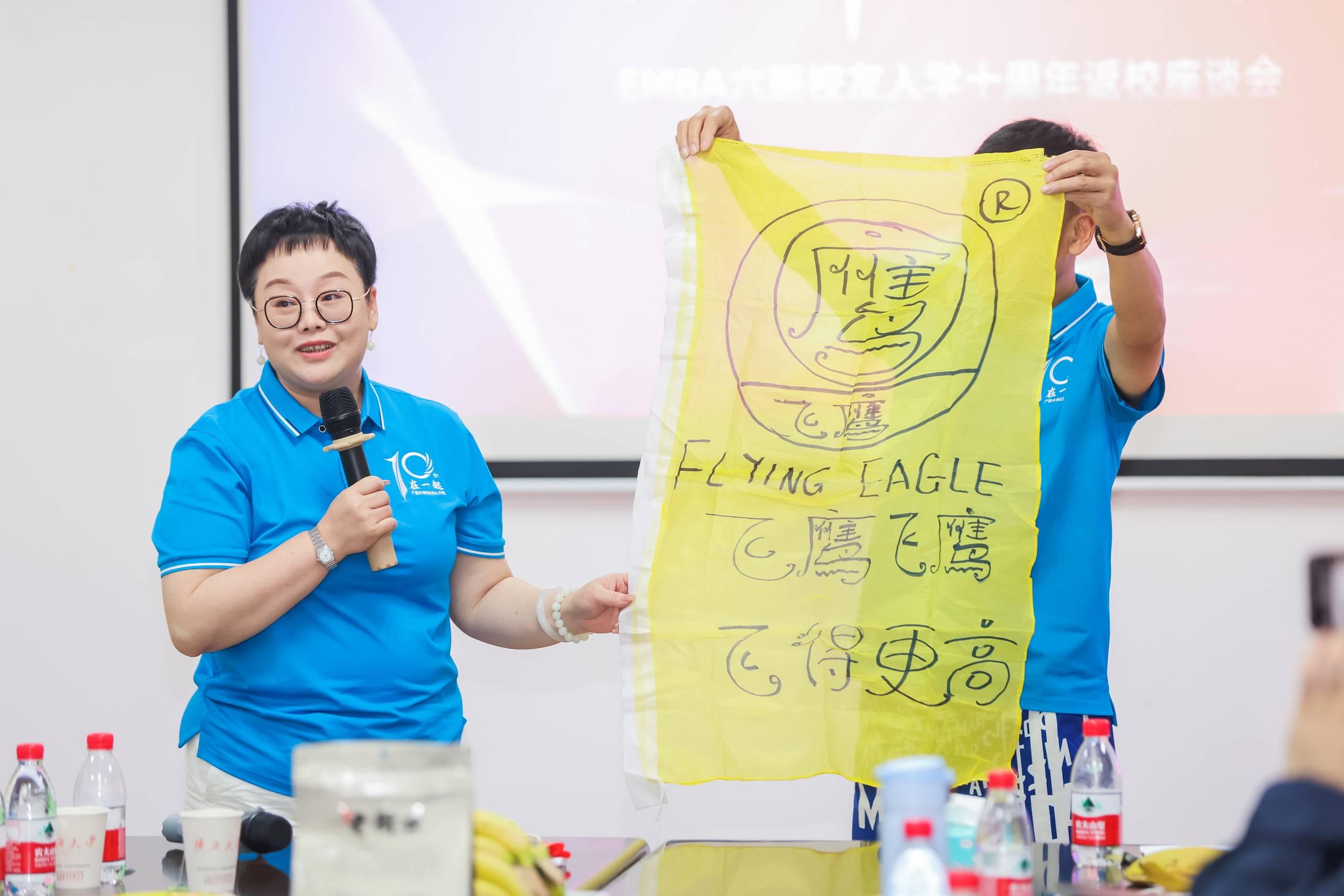 EMBA六班校友赖粤峰、李朝阳展示十年前的入学队旗