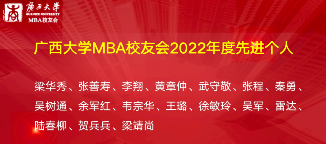 MBA校友会会长梁华秀作2022年工作总结,他表示,MBA校友会团队是“广西学历最高的志愿者服务团队”。校友会在2022年开展了系列丰富多彩的活动,包括各类走访交流活动、MBA校友沙龙、MBA校友共享茶室公益平台、MBA校友读书会、慈善公益活动以及形式多样的文体活动等。