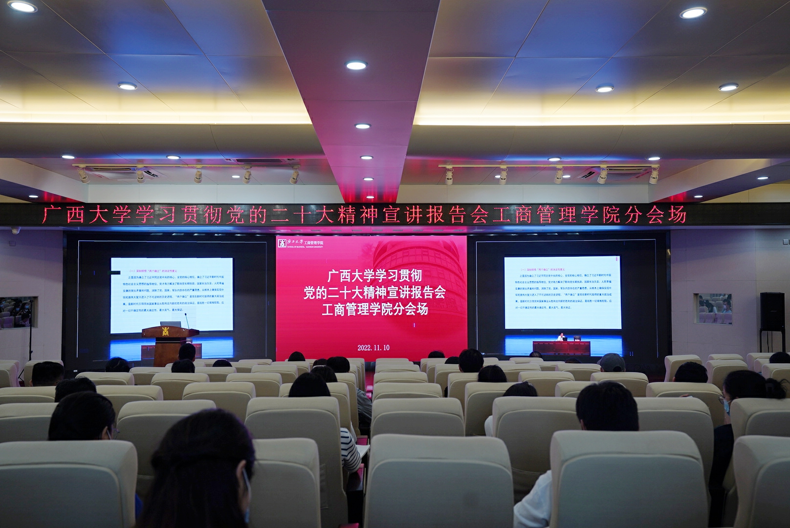 11月10日下午,学习贯彻党的二十大精神自治区宣讲团在我校宣讲,自治区宣讲团成员、自治区党校(广西行政学院)常务副校(院)长胡建华作了宣讲报告。宣讲报告会以线上线下相结合的形式召开,自治区政协副主席、校党委书记王乃学主持报告会。H动画
