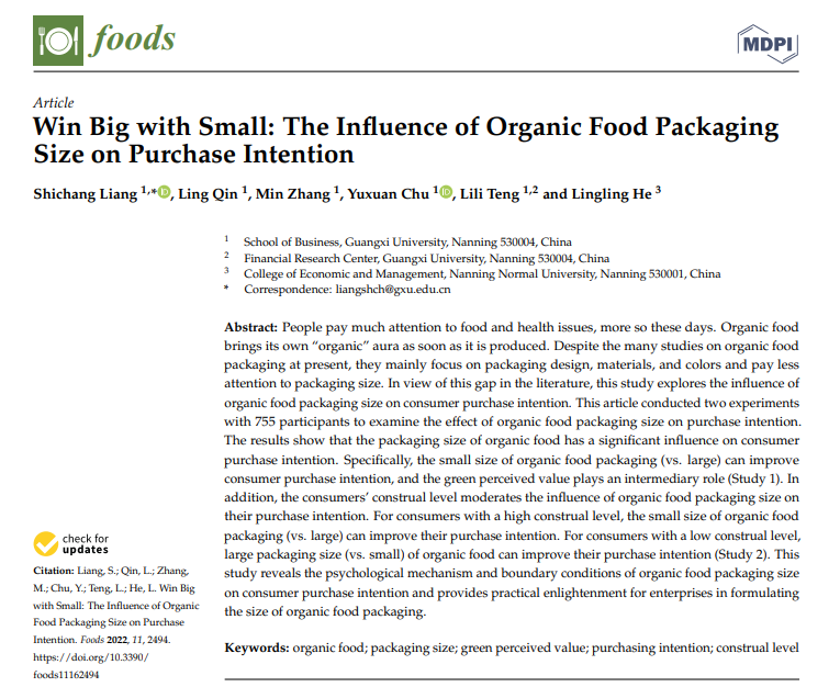 引用格式:Liang S, Qin L, Zhang M, Chu Y, Teng L, He L. Win Big with Small: The Influence of Organic Food Packaging Size on Purchase Intention. Foods. 2022; 11(16):2494.