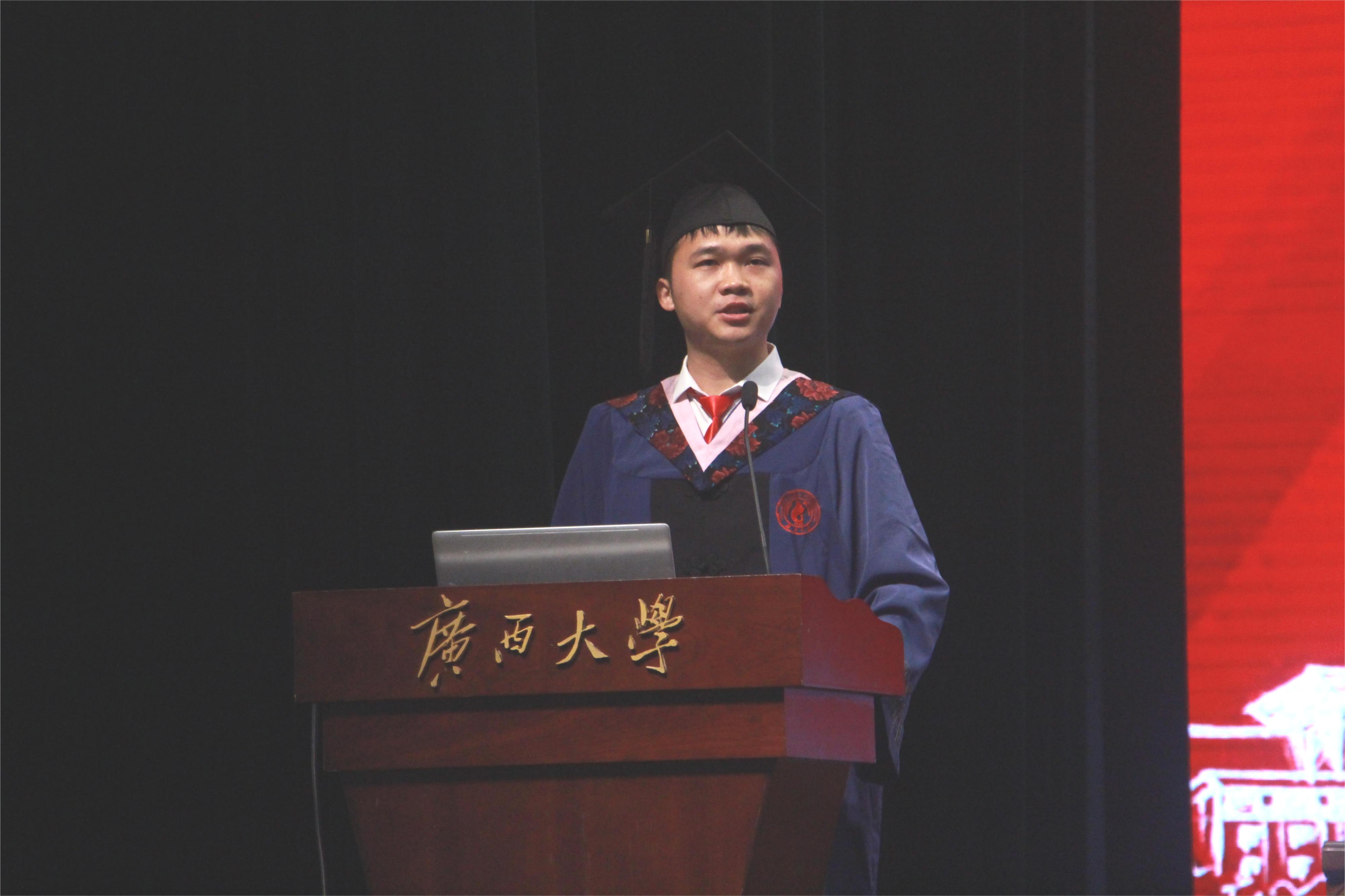 不仅教会我博采众长、挑战自我,更教会我勤恳朴诚、厚学致新的人生态度”。他表示,丰富多彩的研究生生活是一个熔炉,熔炼出每个人与众不同的个性和品格。他对学校、学院和老师们的栽培表示深深的感谢,为即将毕业的同学们送上了美好的祝福:愿同学们能以梦为马,不负韶华。