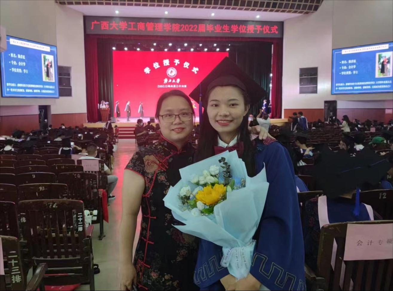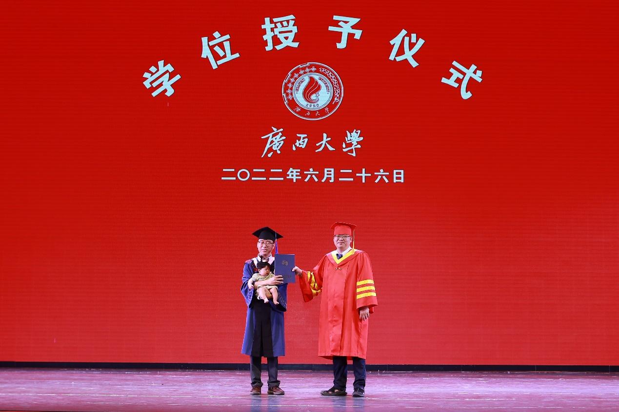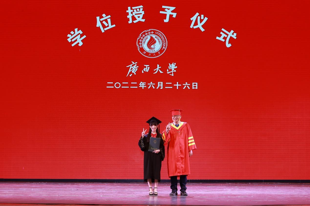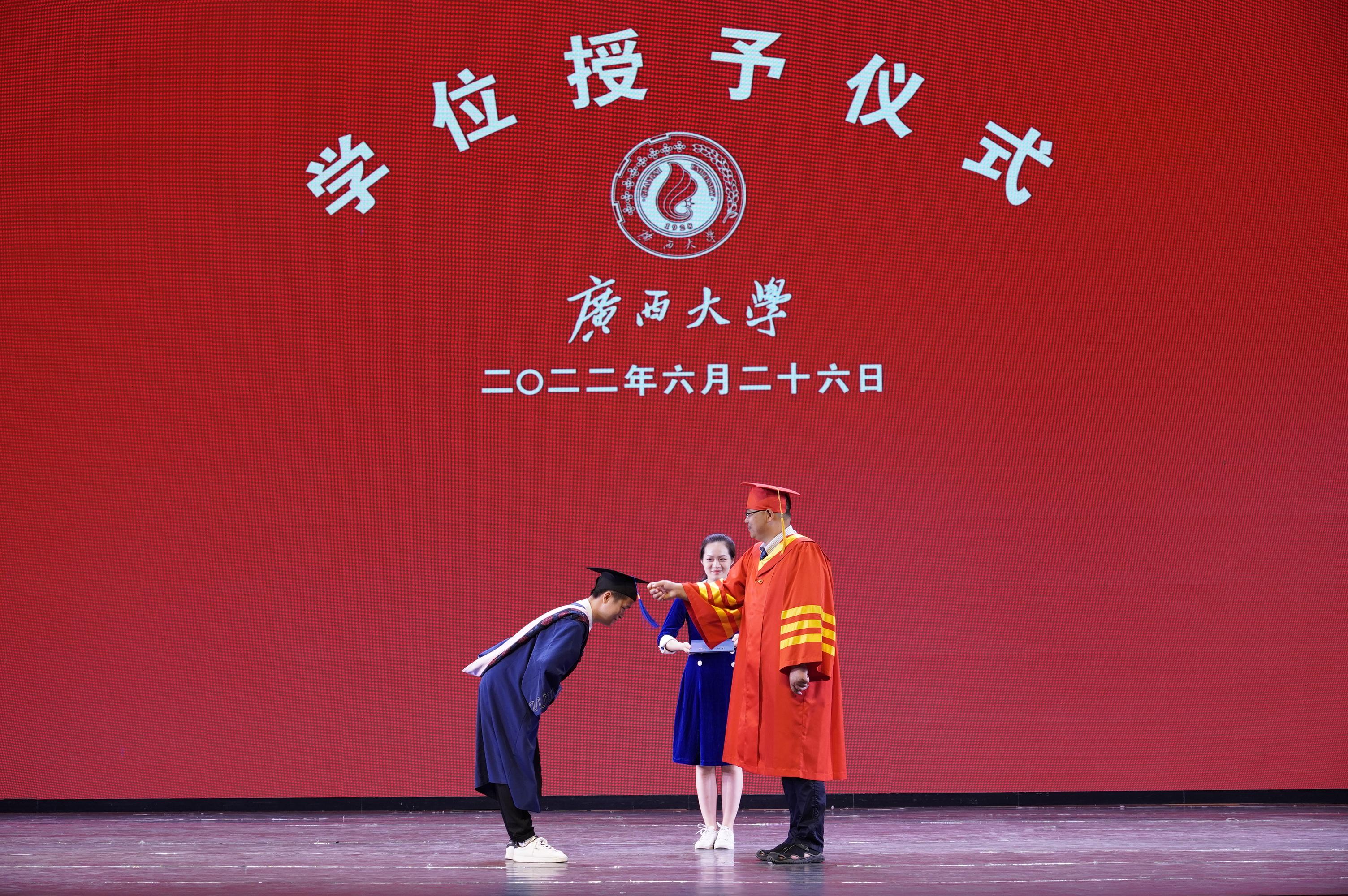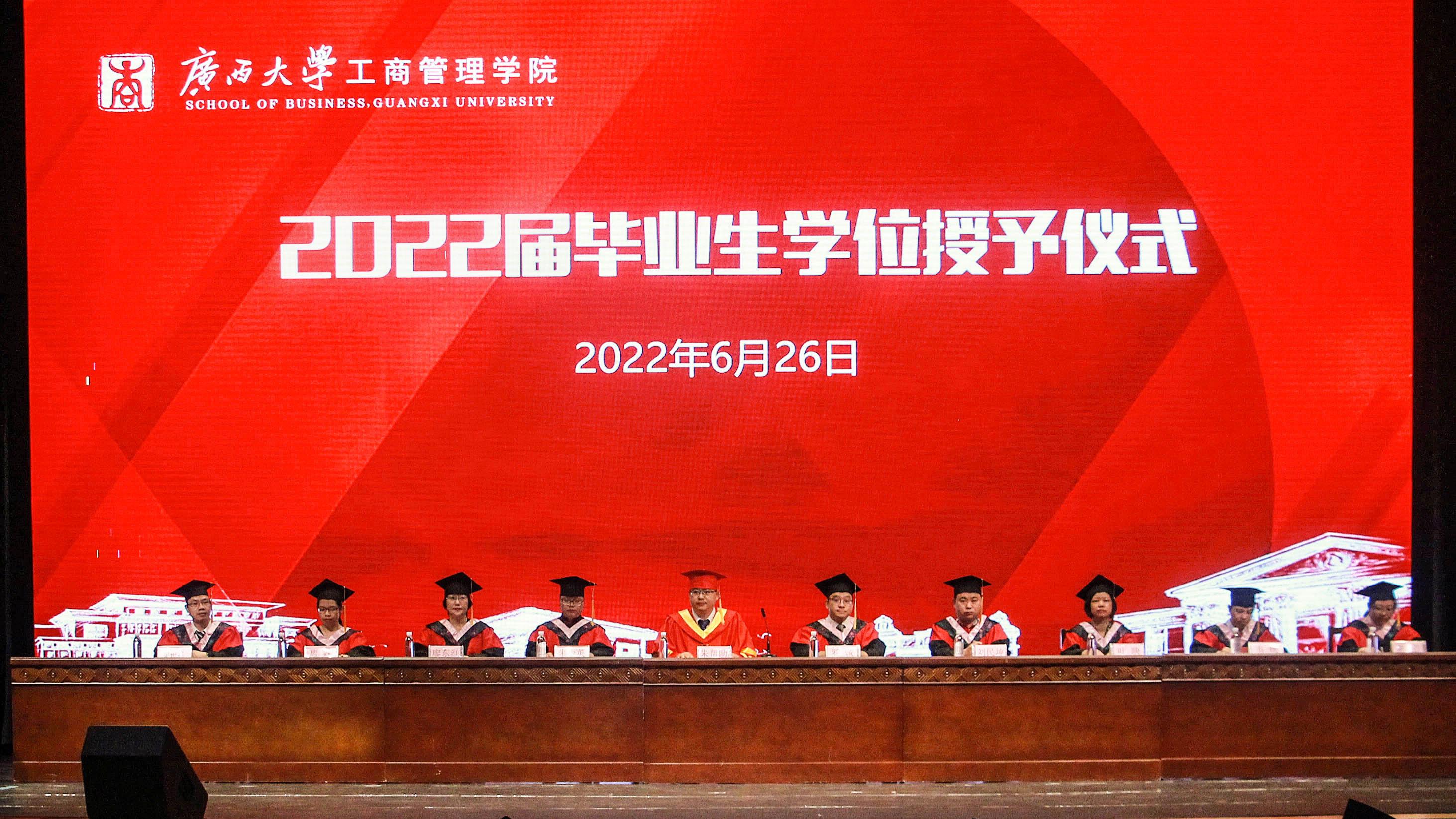 在学校大礼堂为2022届755人毕业生(其中研究生485人,本科生270人)举行庄严而隆重的毕业典礼暨学位授予仪式。院党委书记罗诚,院长朱帮助,院党委副书记黄晋,副院长朱少英、刘民坤、廖东红,教师代表叶映、韦铁、郭峦、唐妤、梁世昌出席仪式。仪式由院党委副书记黄晋主持。