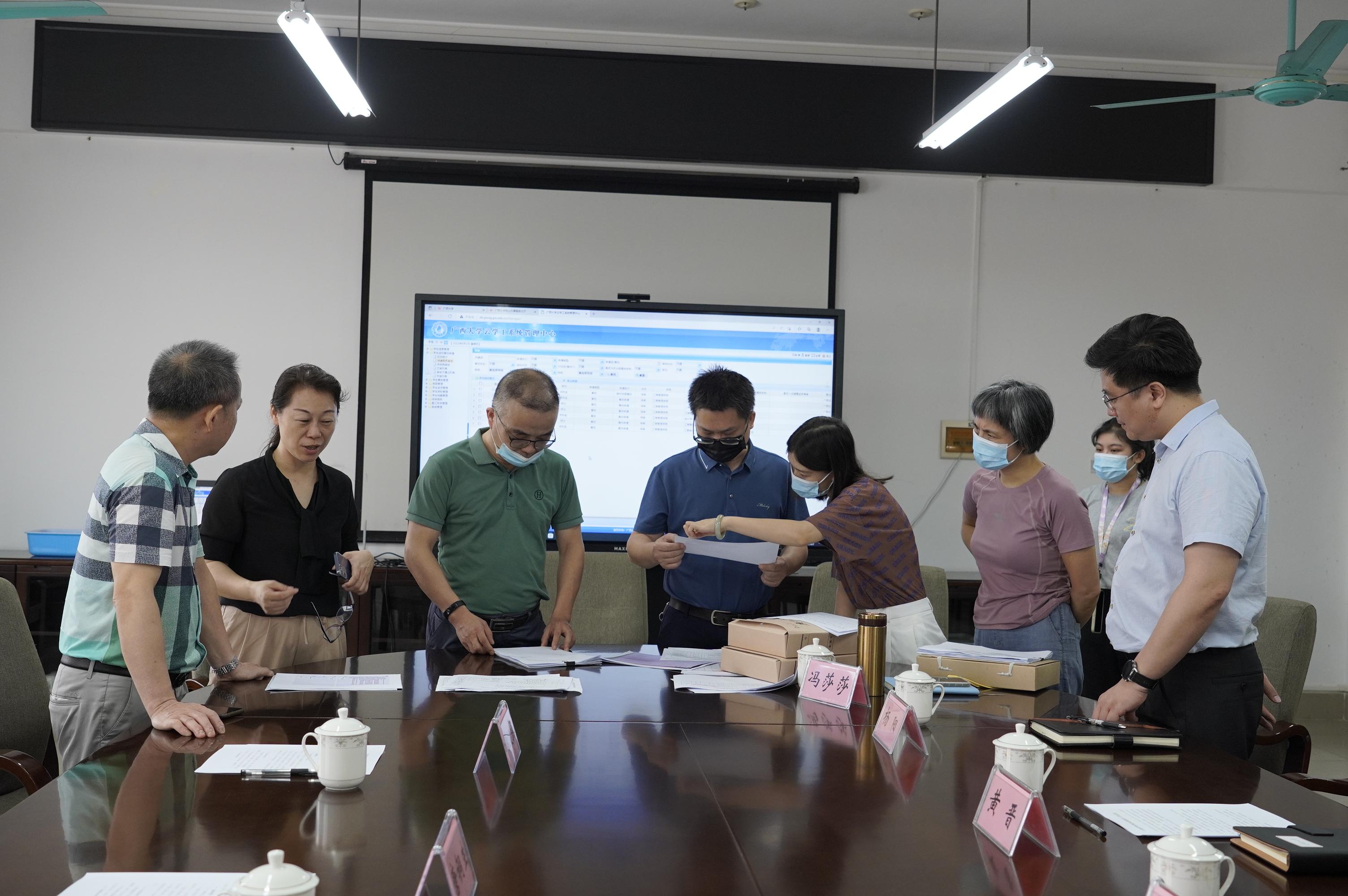 督查组在420会议室详细查阅了学院消毒台账、学生进出校审批材料、教职工离邕审批材料、校外人员申请进校双码和核酸检测情况等原始纪录,认真听取了学院对疫情防控工作开展落实的介绍,详细询问了检查防控工作流程和具体措施。