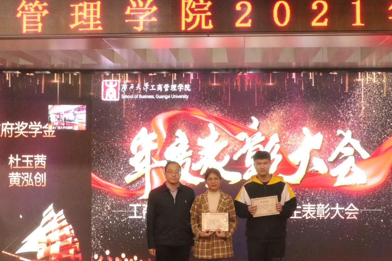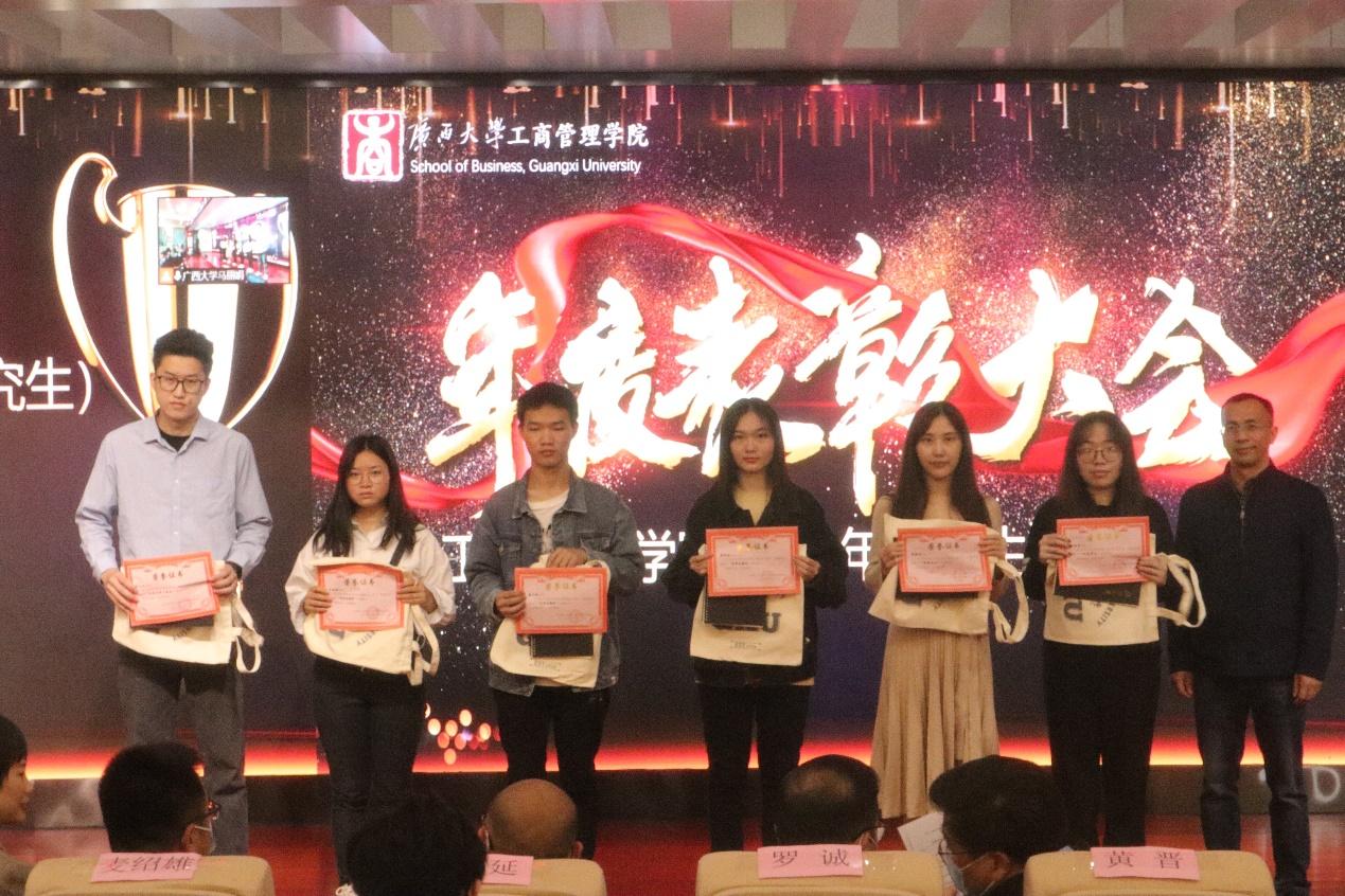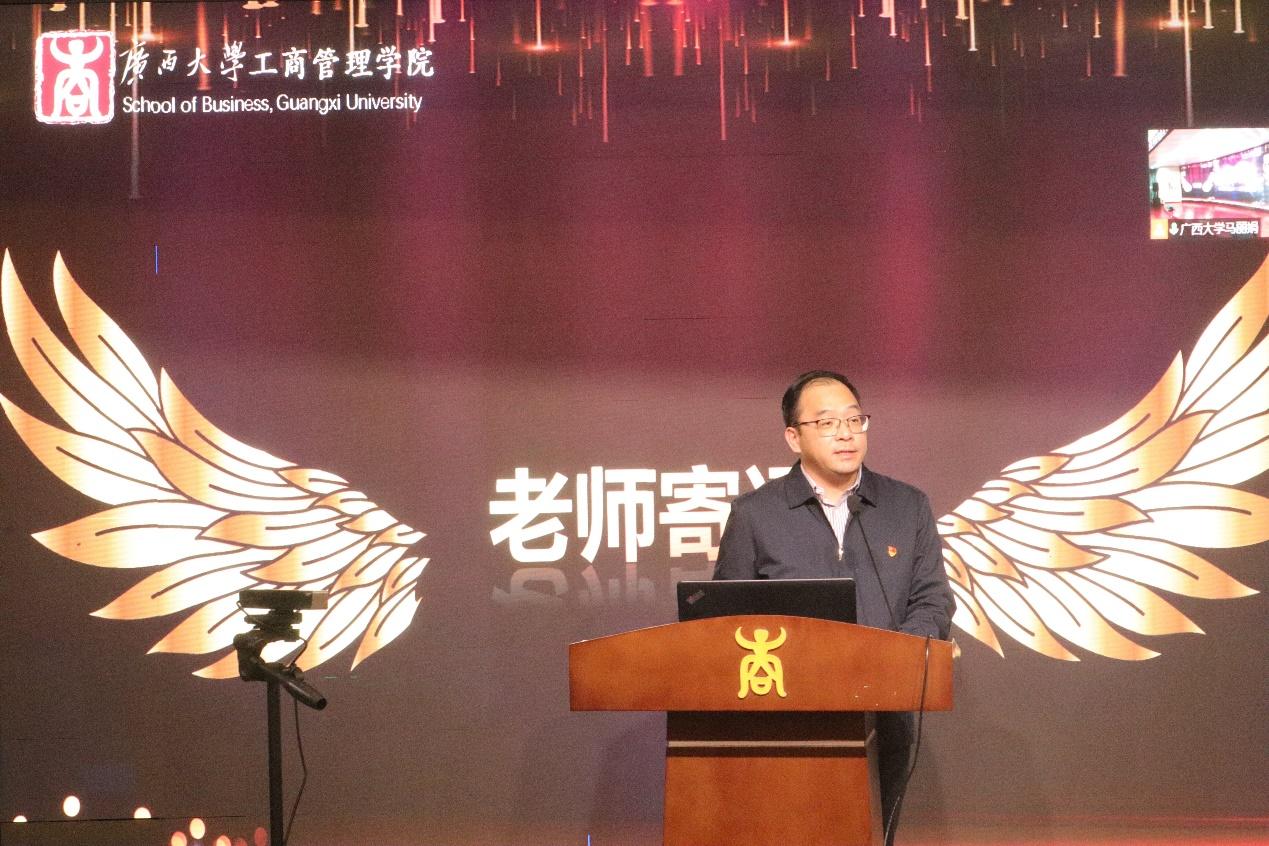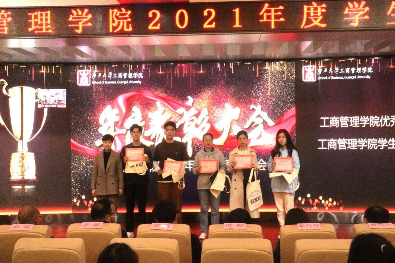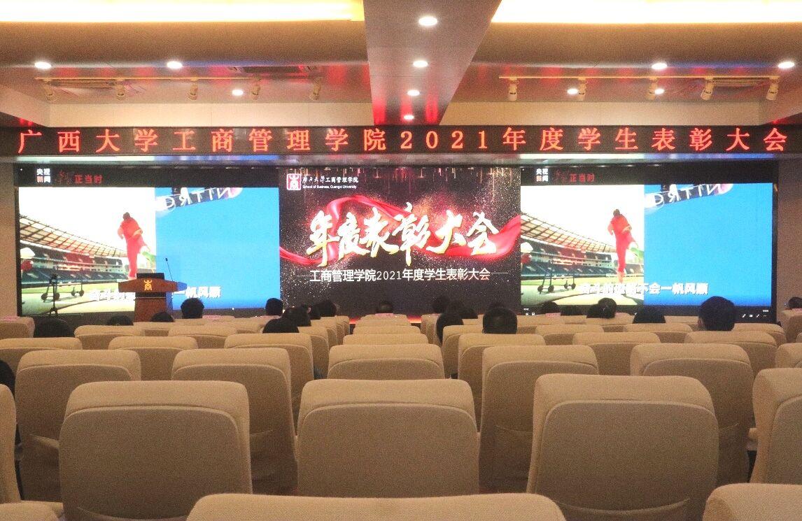 2021年度学生表彰大会在128报告厅隆重举行。本次大会采用“线上直播+线下表彰”的全新方式,学院党委书记罗诚出席大会并致辞,学院党委副书记黄晋,研究生管理中心、组织员办、教学办等部门负责人,学工组全体老师和上海高顿教育培训有限公司广西分校的嘉宾代表以及学生代表共43人参加线下会议,1200余名师生线上观看。