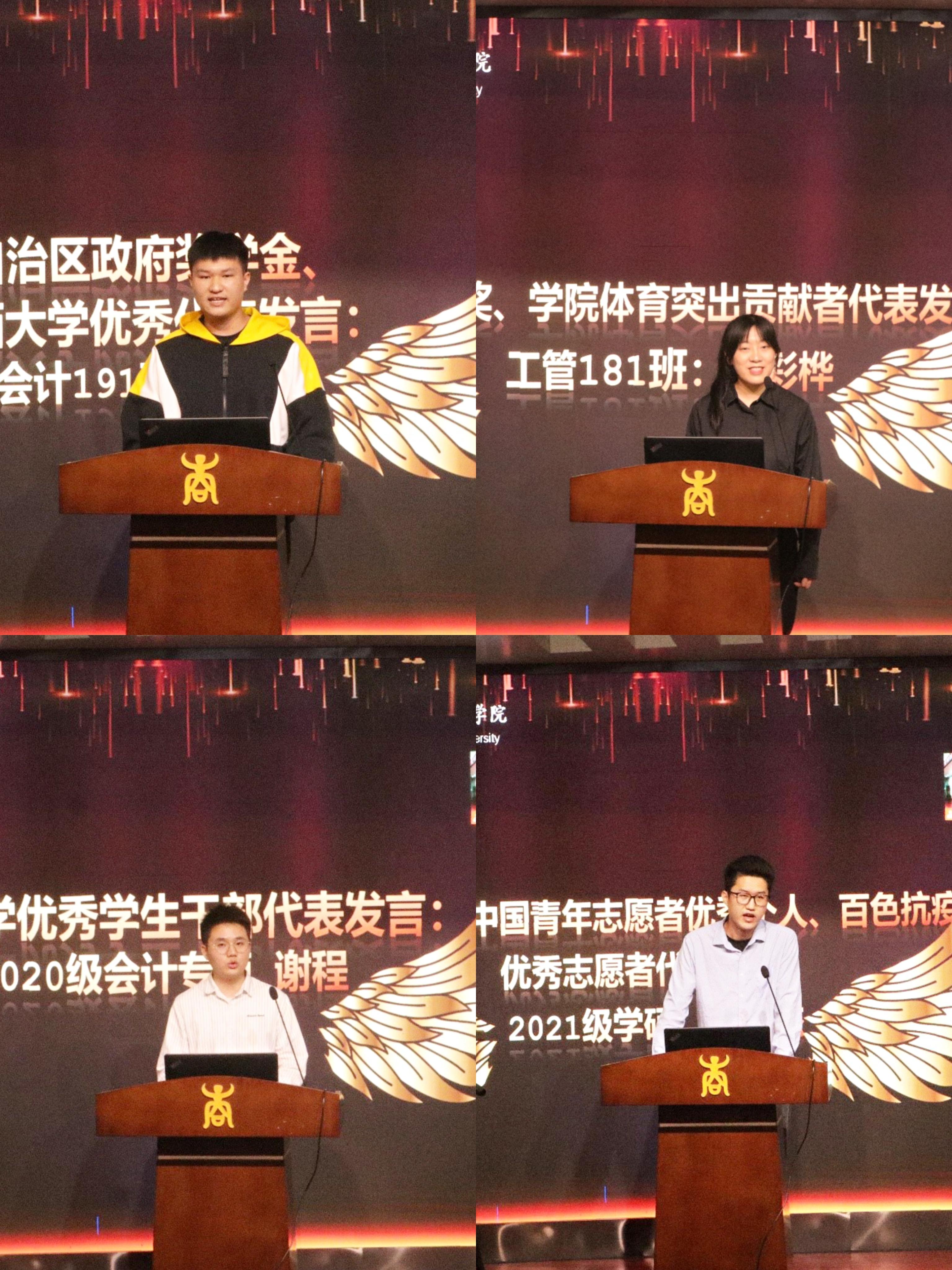 优秀学生干部代表谢程,第十三届中国青年志愿者优秀个人、百色抗疫优秀志愿者代表陈允杰等四位同学分别上台发表获奖感言。他们对学院领导和老师表达了衷心的感谢,回顾了自己在大学期间参加各类学科竞赛、考研、学生工作、百色抗疫等经历,分享心得体会,总结成功经验,体现了对学习、生活和集体的热爱。