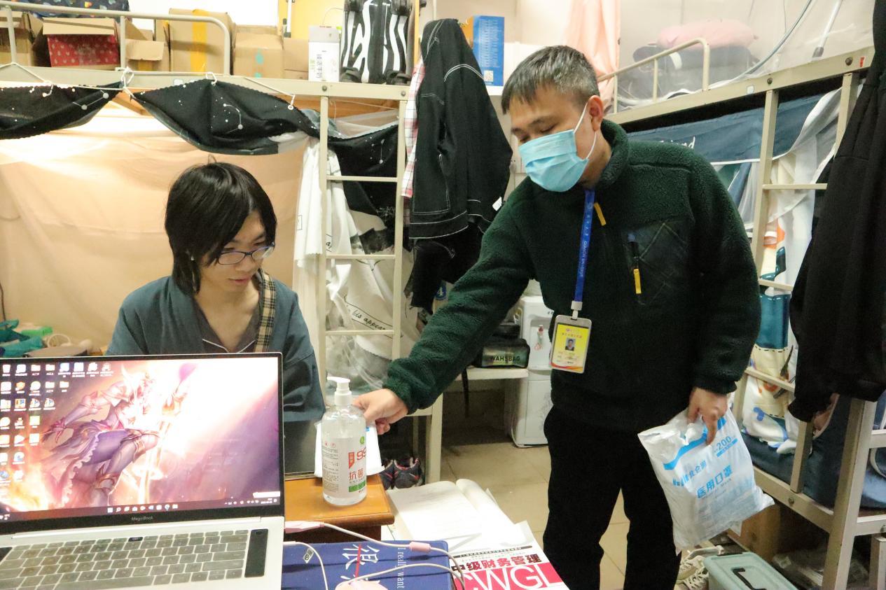 学生在疫情防控状态下的思想、线上学习、生活等情况,并为同学们送上免洗洗手液、口罩等防疫物资。