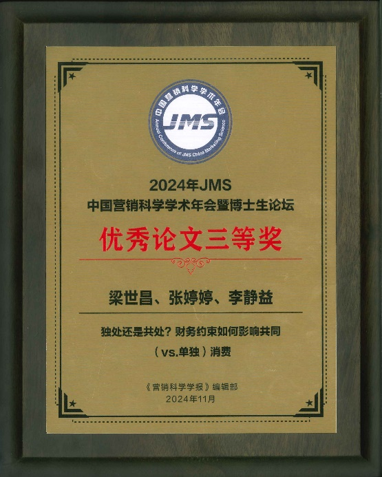 梁世昌副教授指导的2022级硕士研究生张婷婷、李静益撰写的论文《独处还是共处?财务约束如何影响共同(vs.单独)消费》荣获年会优秀论文三等奖,并获得在学术期刊《营销科学学报》上发表的推荐资格。