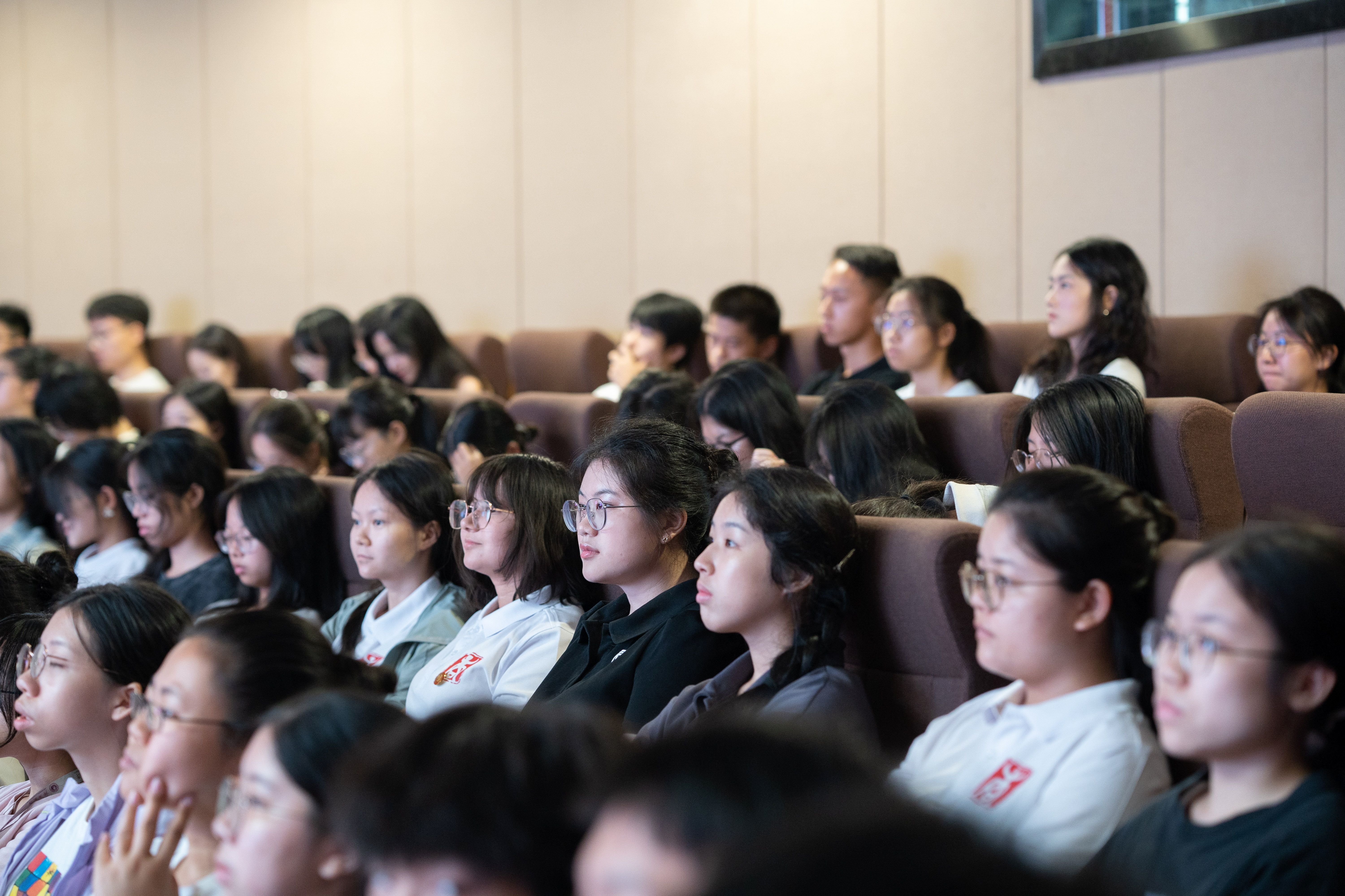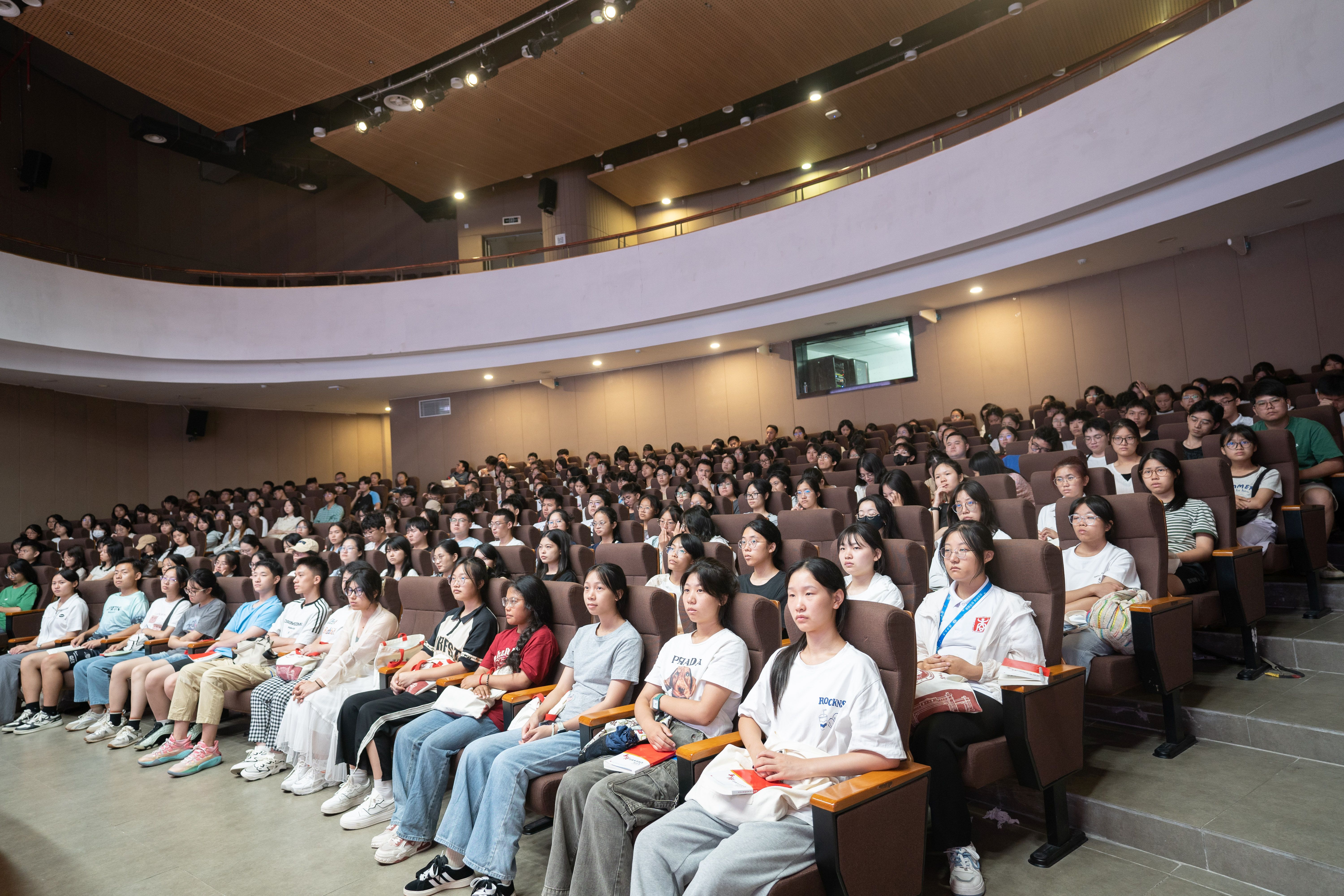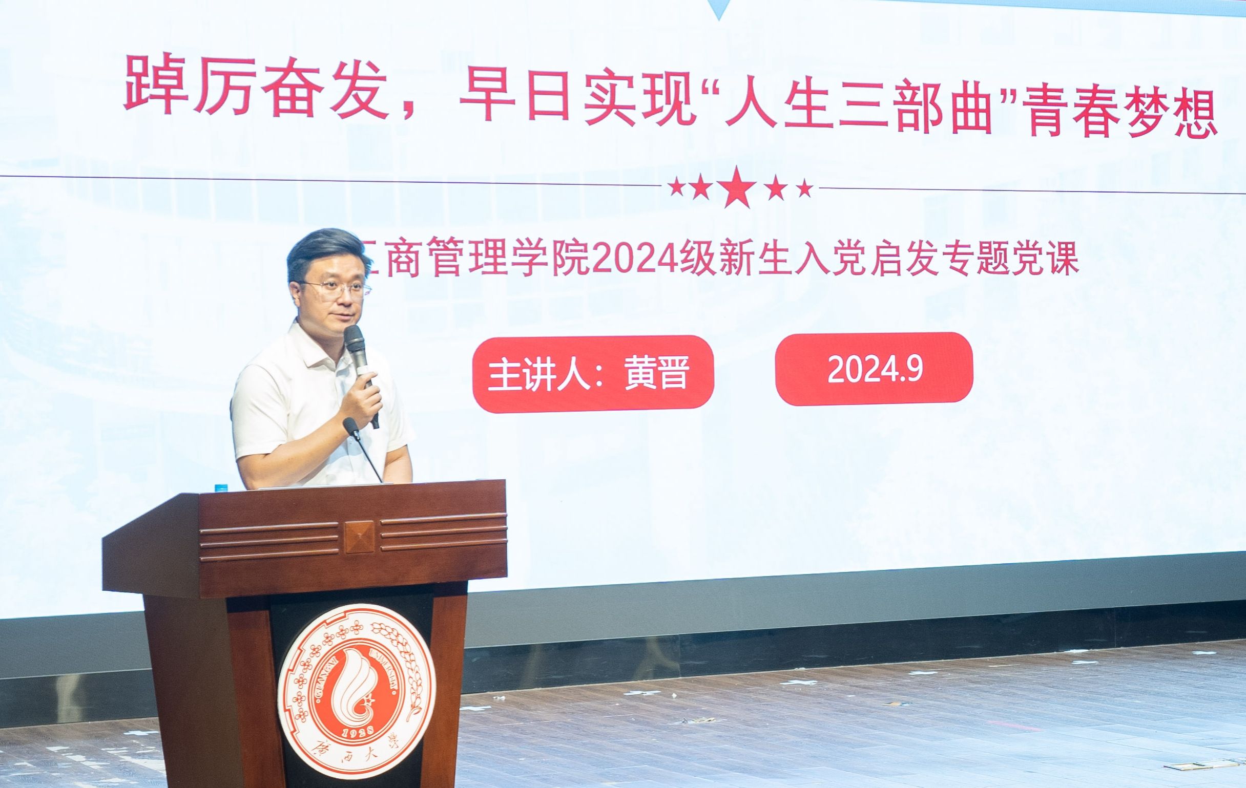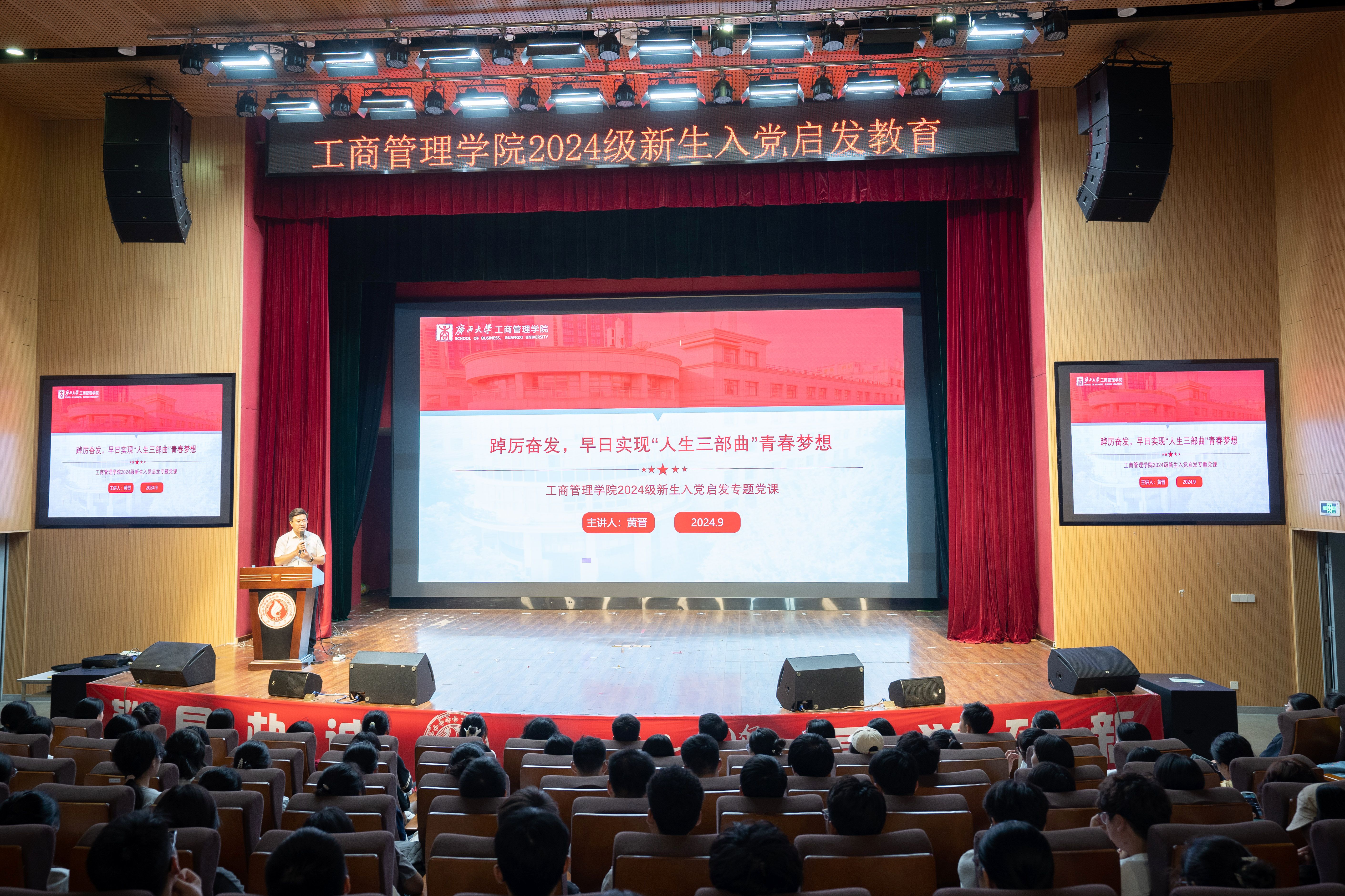 党委在学校大学生活动中心小剧场开展2024级新生入党启发教育。专题党课由学院党委书记黄晋主讲,院党委副书记肖克宁、组织员黄照温、学工组辅导员郁文丹、管雅娣与全体新生一同参与学习。