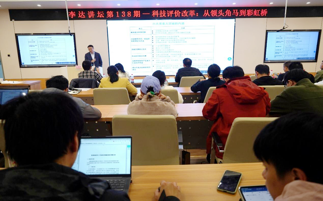 在交流互动环节中,李晓轩研究员就分类评价的相关建议与现场师生们进行了探讨交流。他强调,科技评价改革不仅要注重分类评价的实施,更要充分发挥分类管理的作用,使不同领域、不同层次的科研人才得到精准和公正的评价,从而更好地服务于科技评价和科技创新工作。