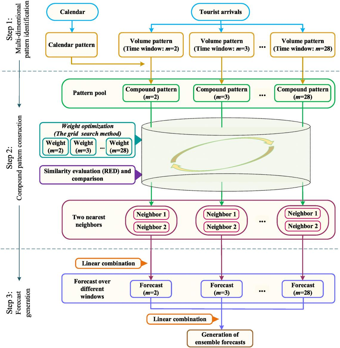 该研究开发了一个复合模式识别预测框架,通过动态组合日历模式和旅游需求模式,利用自适应相似性评估和最优组合算法,捕捉需求与日历复合模式中的特征,来预测景区每日旅游需求。通过对中国三个旅游景区的实证研究,证明了该框架在疫情发生前和发生后均具有良好的预测性能。该研究对旅游需求预测的贡献在于:提出了一种复合模式识别方法,将日历模式和需求量模式构建复合模式用于模式识别;引入了自适应权重,动态测度模式相似性;通过动态组合不同时间窗口的预测结果,提高预测的鲁棒性和准确性。