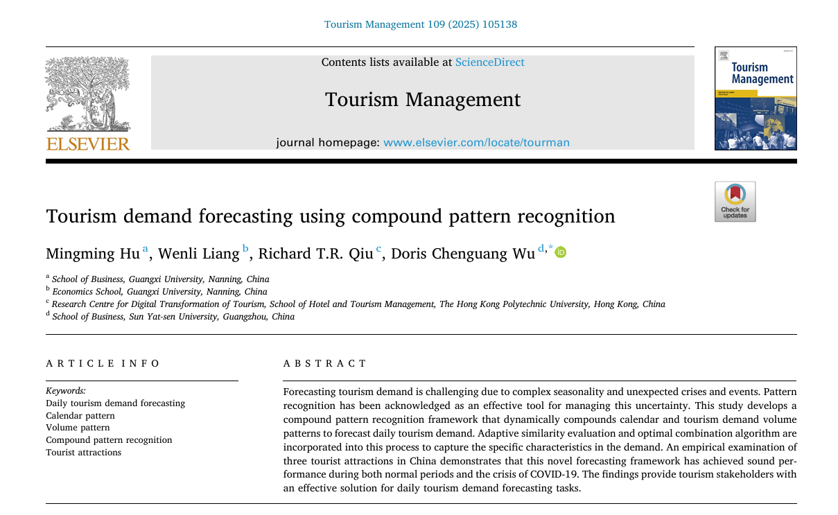 胡明明团队在基于复合模式识别的旅游需求预测领域取得新进展,研究成果以“Tourism demand forecasting using compound pattern recognition”为题,在旅游管理国际三大顶刊之一的《Tourism Management》上发表。论文的第一作者为H动画