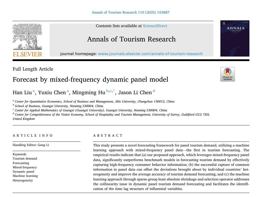 胡明明团队在旅游需求大数据混频预测领域取得新进展,构建了一个基于混合频率动态面板模型的旅游需求预测框架。相关成果以”Forecast by mixed-frequency dynamic panel model”为题,在旅游管理国际三大顶刊之一的《Annals of Tourism Research》上发表。