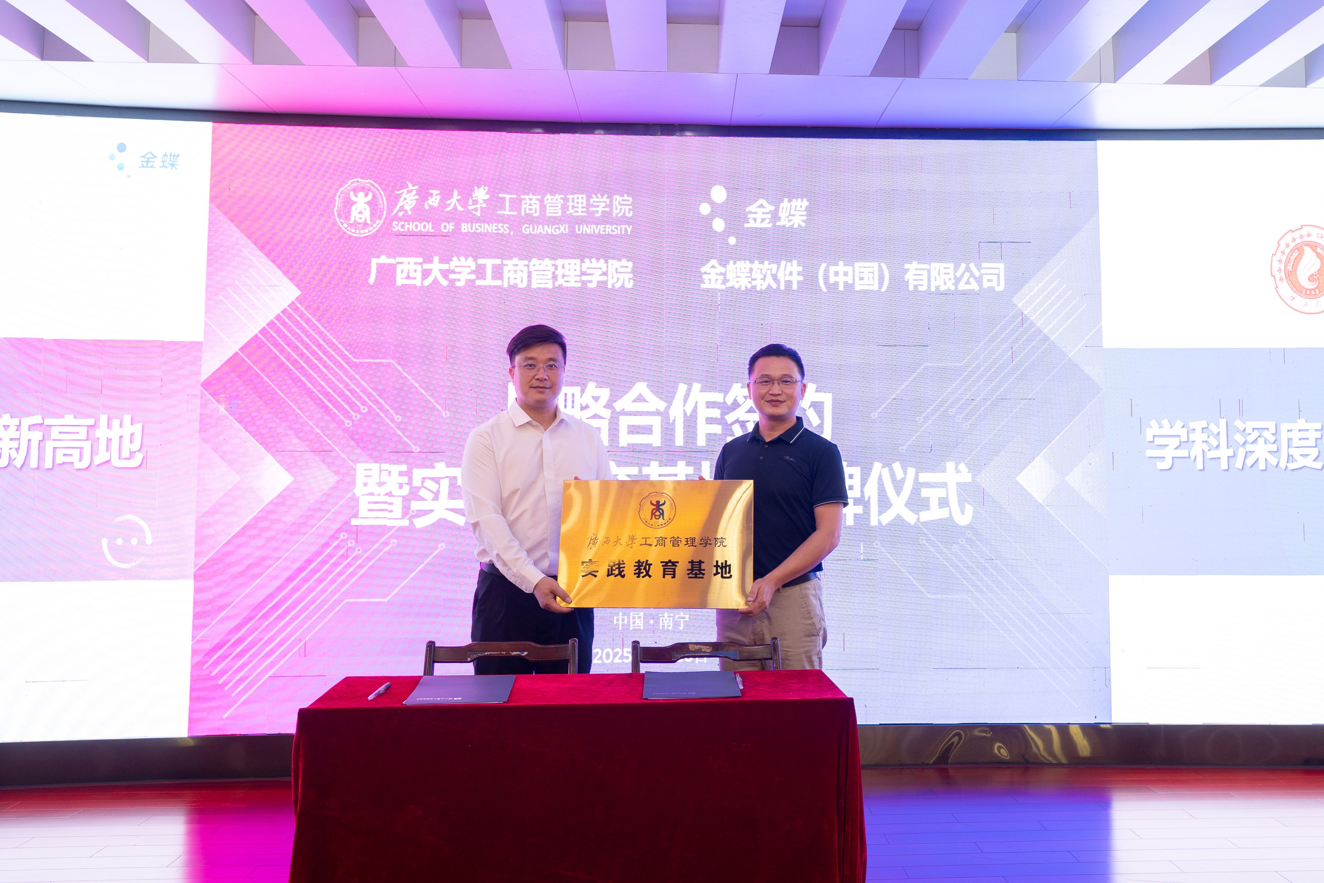 在与会代表的共同见证下,黄晋与陈跃分别代表校企双方签署合作协议,并为“AI+数智化人才培养基地”揭牌。这标志着双方在AI与数智化领域共育高端人才的新篇开启,也预示着校企协同创新成果将加速涌现。