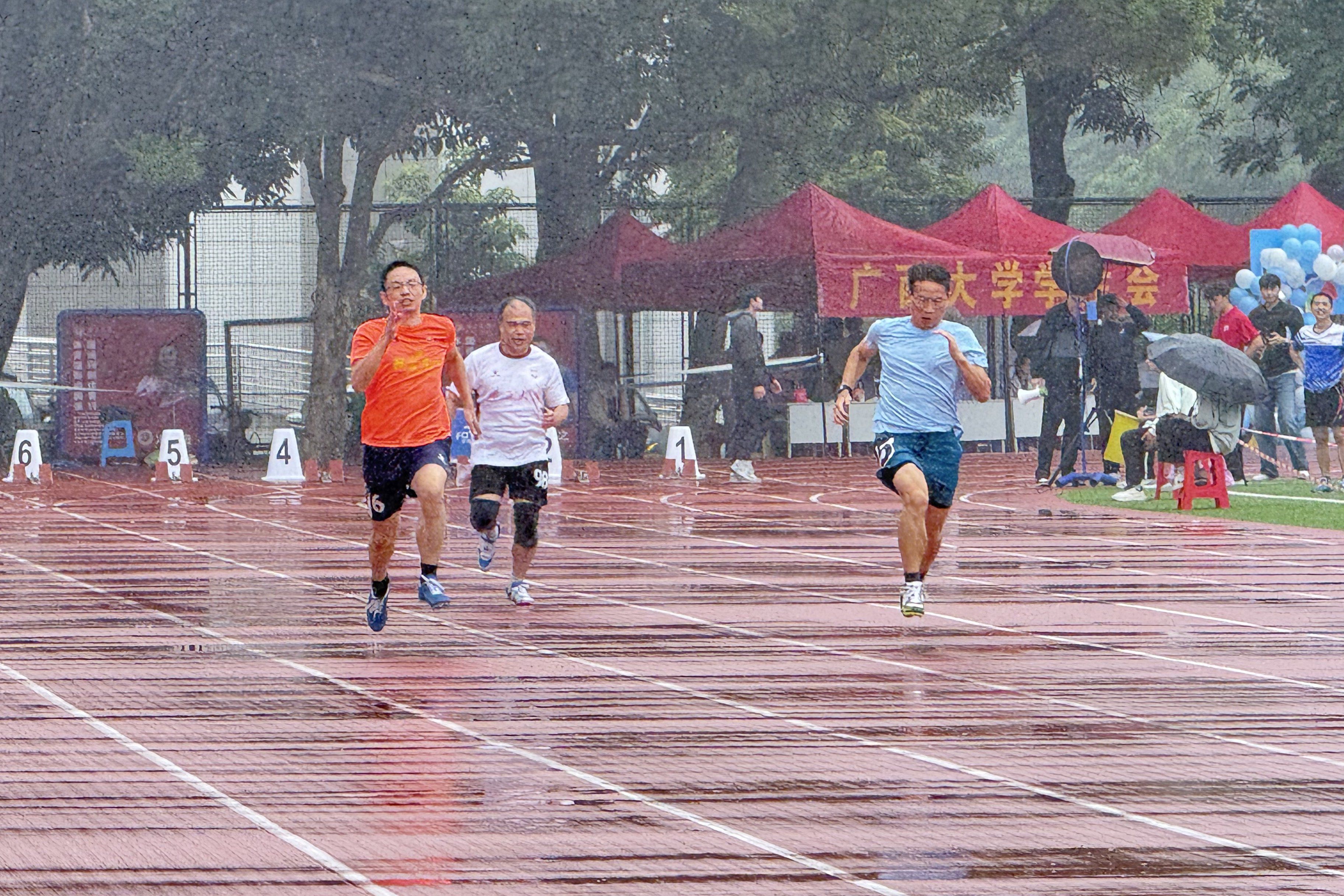 尽管细雨纷飞、气温骤降,老师们仍以饱满的热情点燃了田径场的激情。短跑赛道上,他们如离弦之箭冲破雨幕;长跑征程中,他们以坚韧的步伐诠释坚持的力量;铅球、跳远等项目中,他们一次次挑战自我极限,用力量与技巧书写精彩瞬间。尤其在4×100米接力赛中,四棒选手默契配合、无缝衔接,以风驰电掣的速度引得全场欢呼,成为雨中一道振奋人心的风景线。