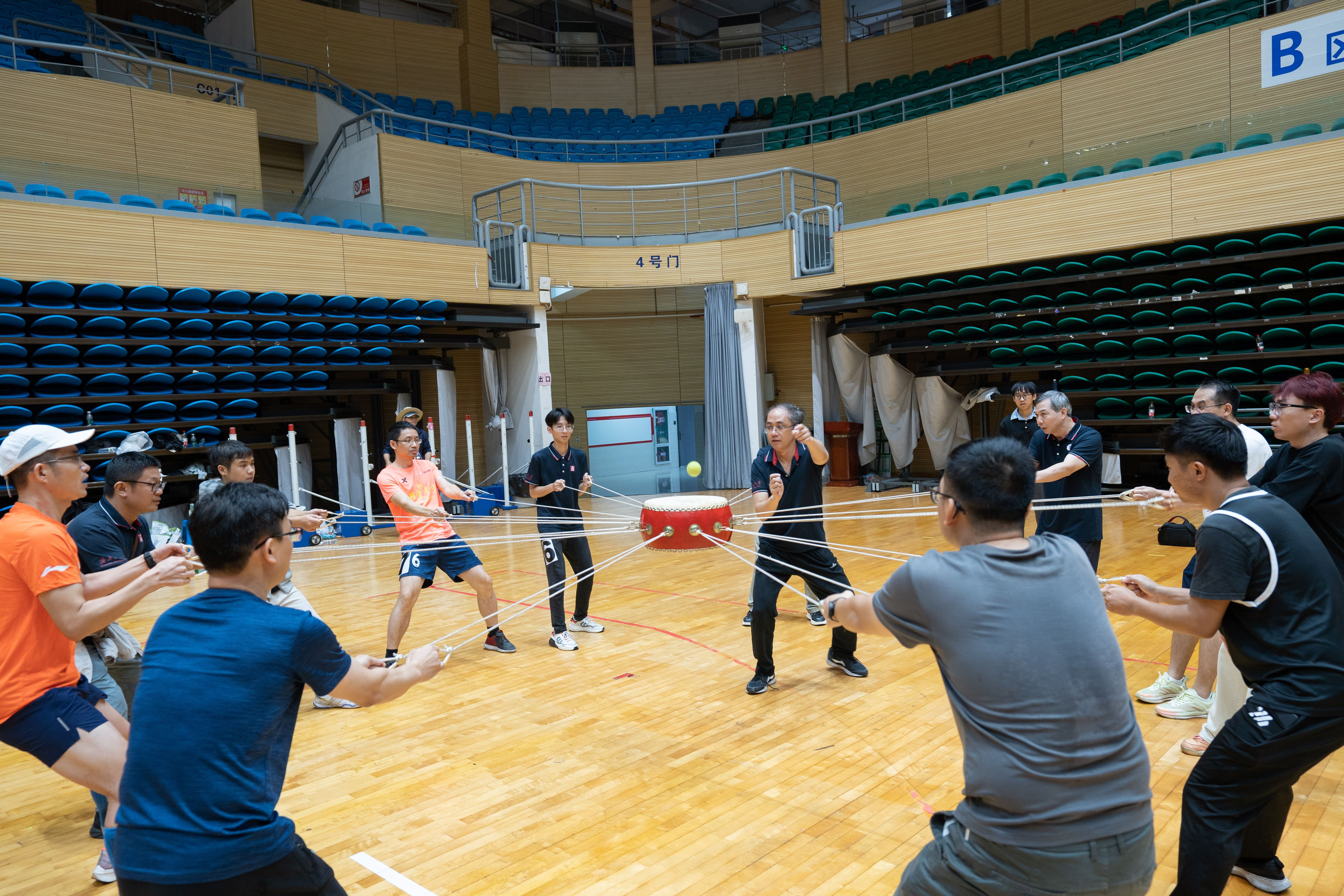 代表队在男子击鼓颠球比赛中