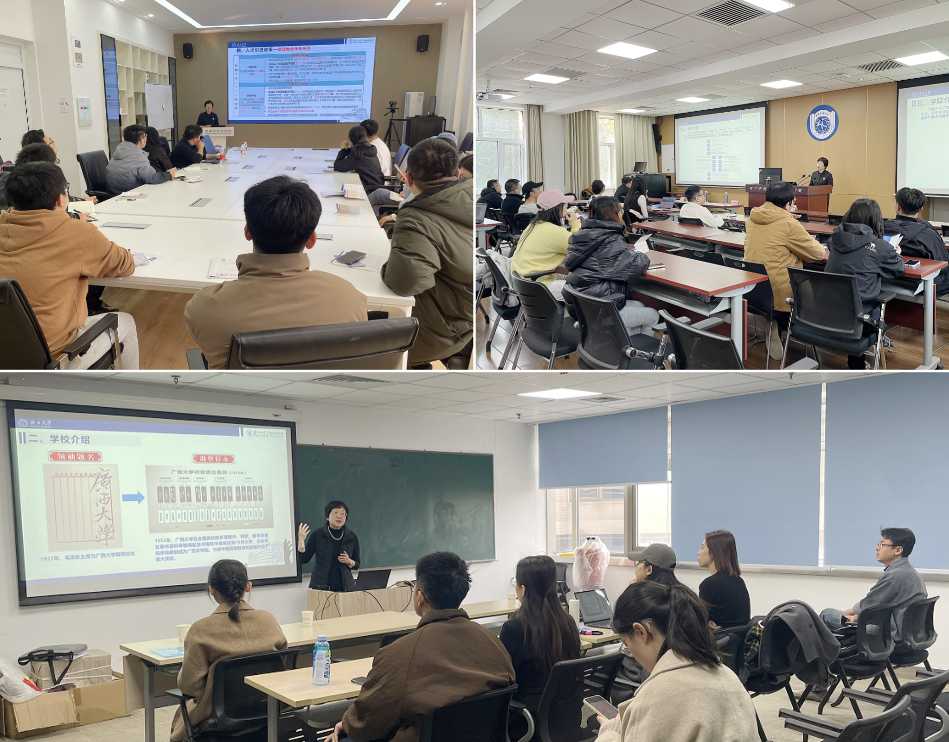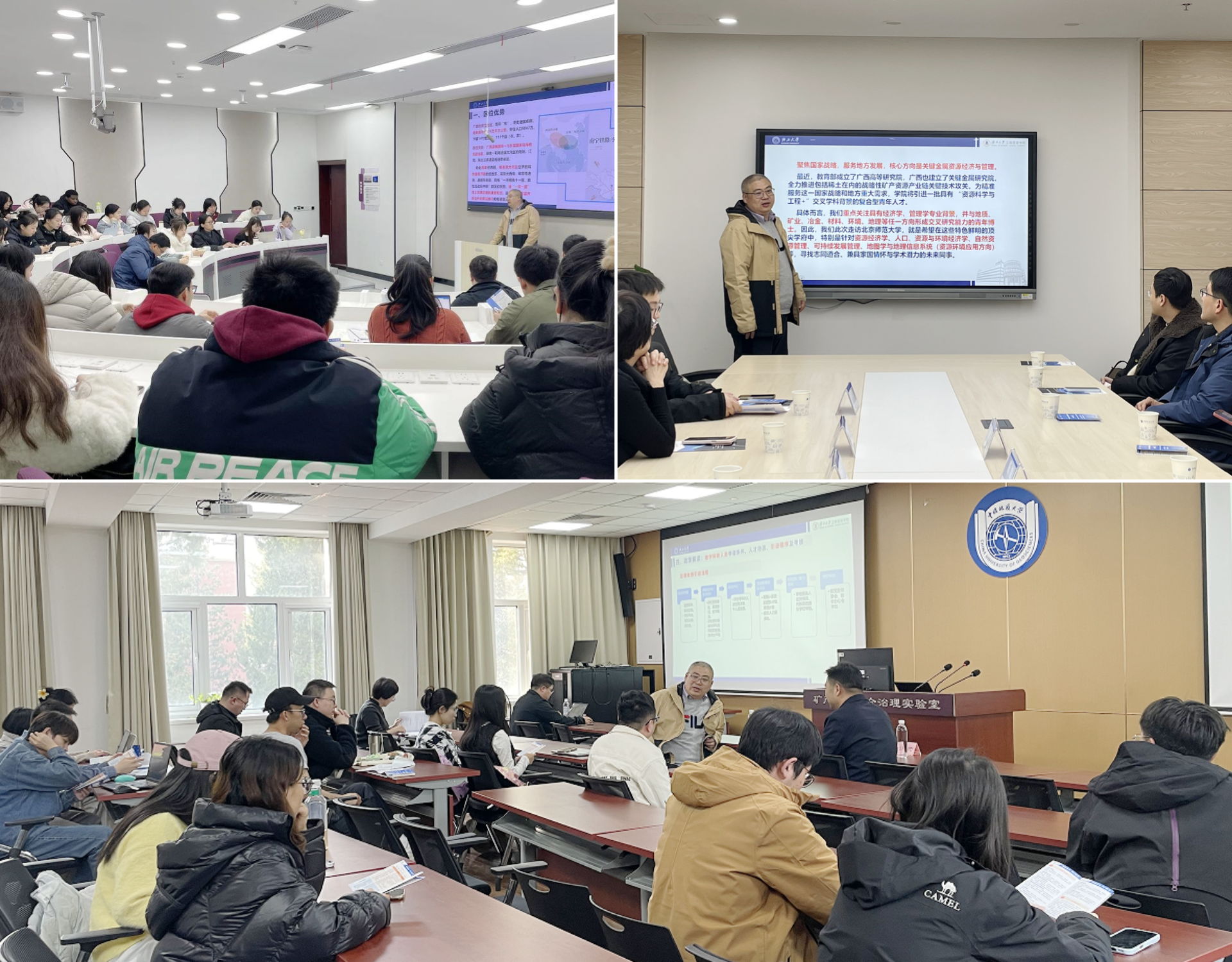 廖东红在中国矿业大学(北京)能源与矿业学院(左上)、中国地质大学(北京)经济管理学院(右上)、