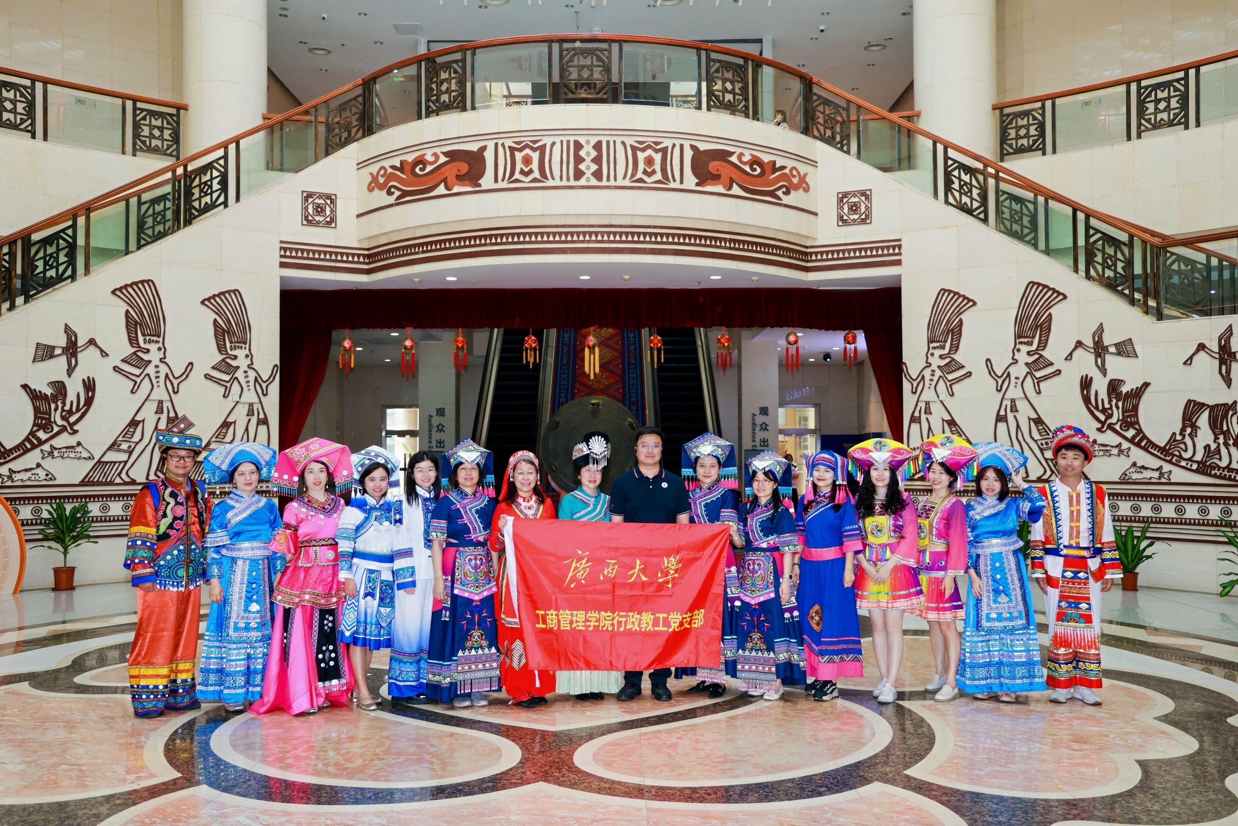 4月14日,春和景明,惠风和畅。为进一步深化民族团结进步教育,引导行政党员教师坚定文化自信、树牢正确政绩观,学院教工行政党支部组织全体党员走进广西民族博物馆,开展“铸牢中华民族共同体意识”主题党日活动。