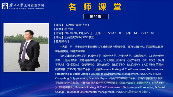 课程第一天,在师生们的热烈欢迎下,朱帮助院长为上课的师生们作课程学习动员讲话,耐心的指出《高级计量经济学》主要的学习重点。参加此次名师课堂的主要有H动画