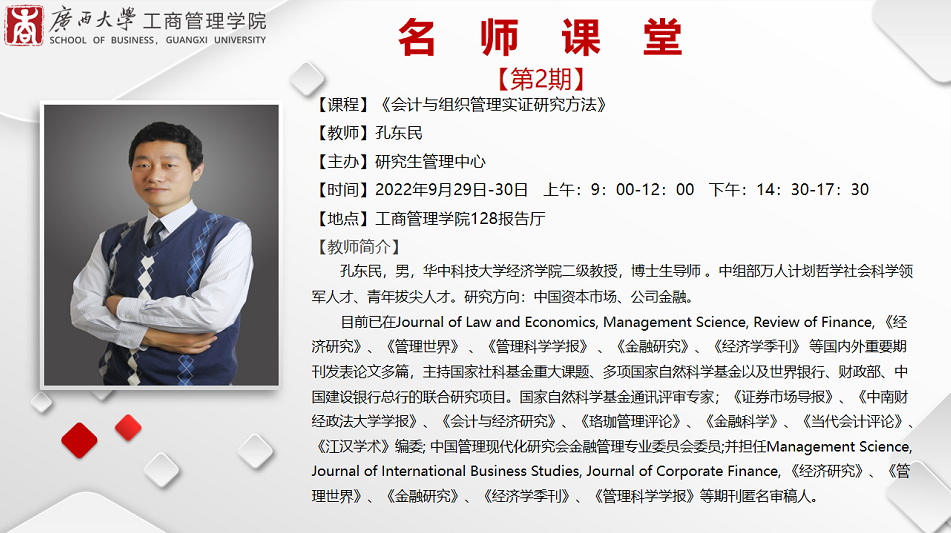 邀请华中科技大学经济学院二级教授、博士生导师孔东明到校讲授《会计与组织管理实证研究方法》。孔教授以“实证研究中的因果识别”为主题,在H动画
