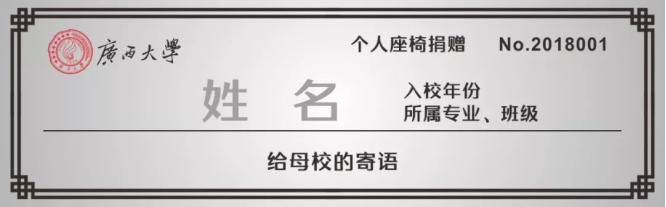 校友认捐后,学院将在所认捐座位,镌刻校友姓名、专业、班级等信息,让校友在母校留下永恒的印记。捐赠校友同时还将获得H动画