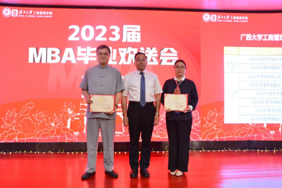 在热烈的掌声中,与会领导分别为获得华南地区2022 年度最受欢迎MBA老师,华南联盟特色联合会、华南联盟MBA 优秀班级、院级优秀毕业生颁发证书和纪念品。