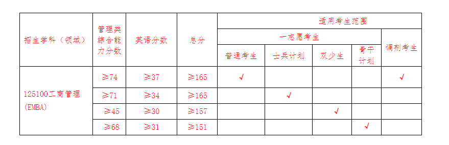 工商管理硕士(EMBA方向)(含少数民族照顾政策考生、少数民族骨干计划考生、士兵计划考生)复试分数线如表1所示: