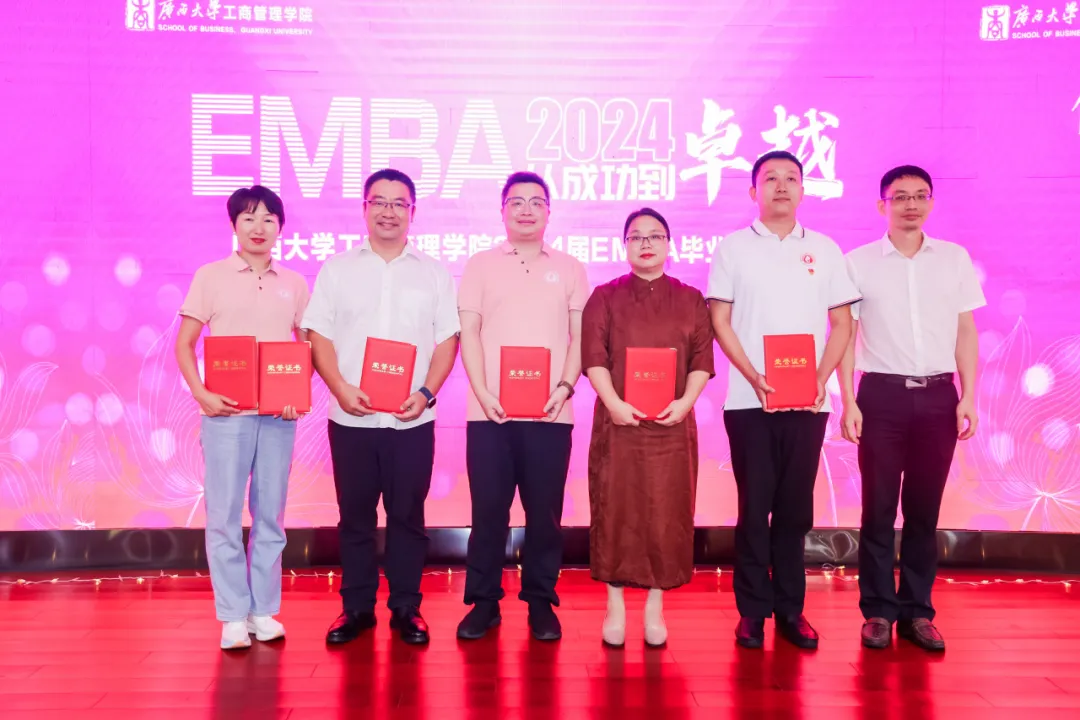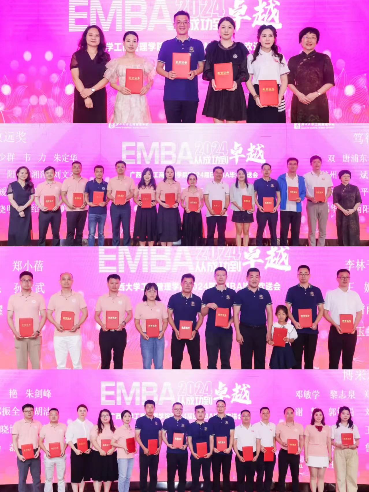 党委副书记肖克宁、副院长朱少英、申韬、刘民坤、廖东红,导师代表唐玉生、覃朝勇等老师出席了欢送会,共同为此次毕业的EMBA同学庆祝。此次欢送会由EMBA21班周艳、EMBA22班居香、EMBA23班陆宏亮主持。