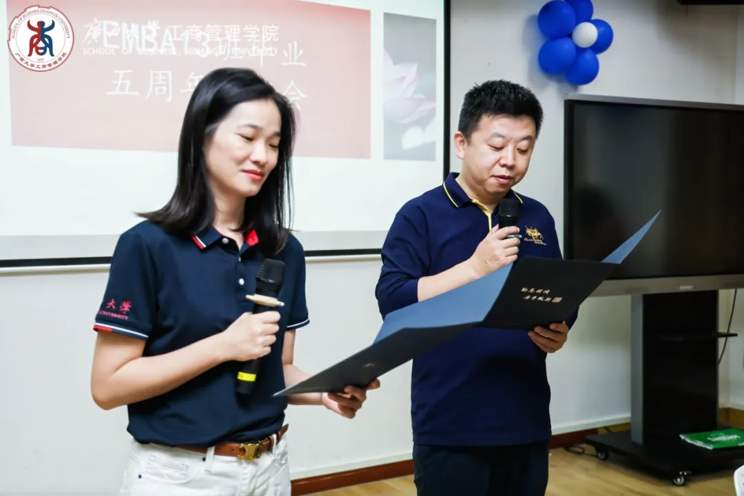 EMBA授课教师代表黎鹏教授感谢校友们五年后带着超正能量和无限热情回校。他带领大家一起回忆了入学和毕业的难忘时刻。他说到,2017年是大家开始在西大逐梦的一年,在校期间兼顾学业、事业、家庭。2019年大家取得了傲人举世瞩目的成绩。如今校友们重返校园,祝愿大家走得更高、更远,从成功走向永恒的成功。
