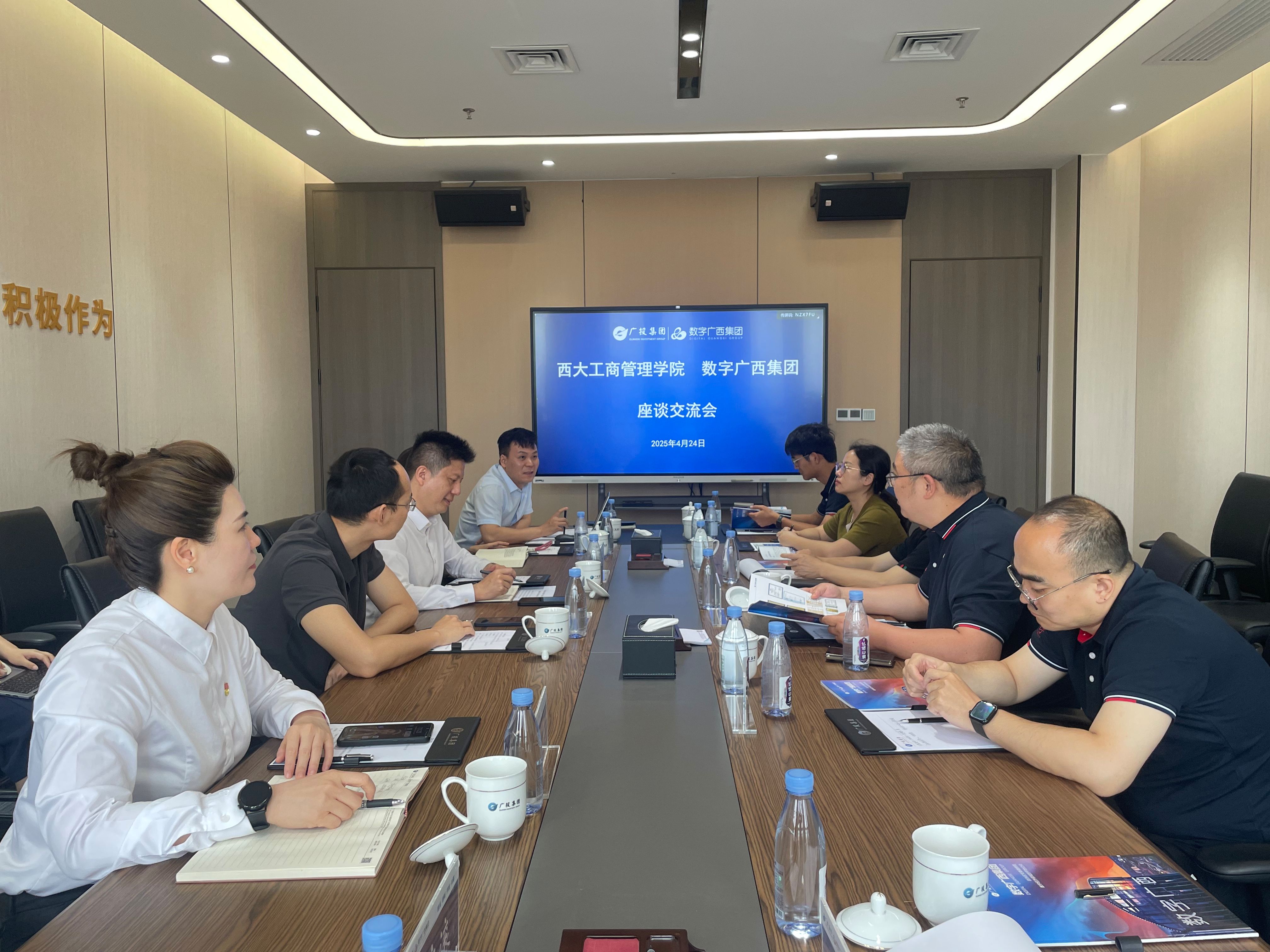在中国-东盟数字经济产业园,调研组受到广西数广全网融合科技有限公司副总经理周艳(2022级EMBA校友)及云上广西网络科技有限公司董事长刘学(2023级MBA学生)等的热情接待。座谈中,双方围绕重点研发项目联合申报、新能源算力中心、东盟舆情智库建设及数字创新实训基地共建等展开探讨。朱帮助表示,学院将发挥学科优势,助力企业数字化转型,打造服务中国-东盟数字经济发展的产学研标杆,推动“AI+行业”战略深度融合。