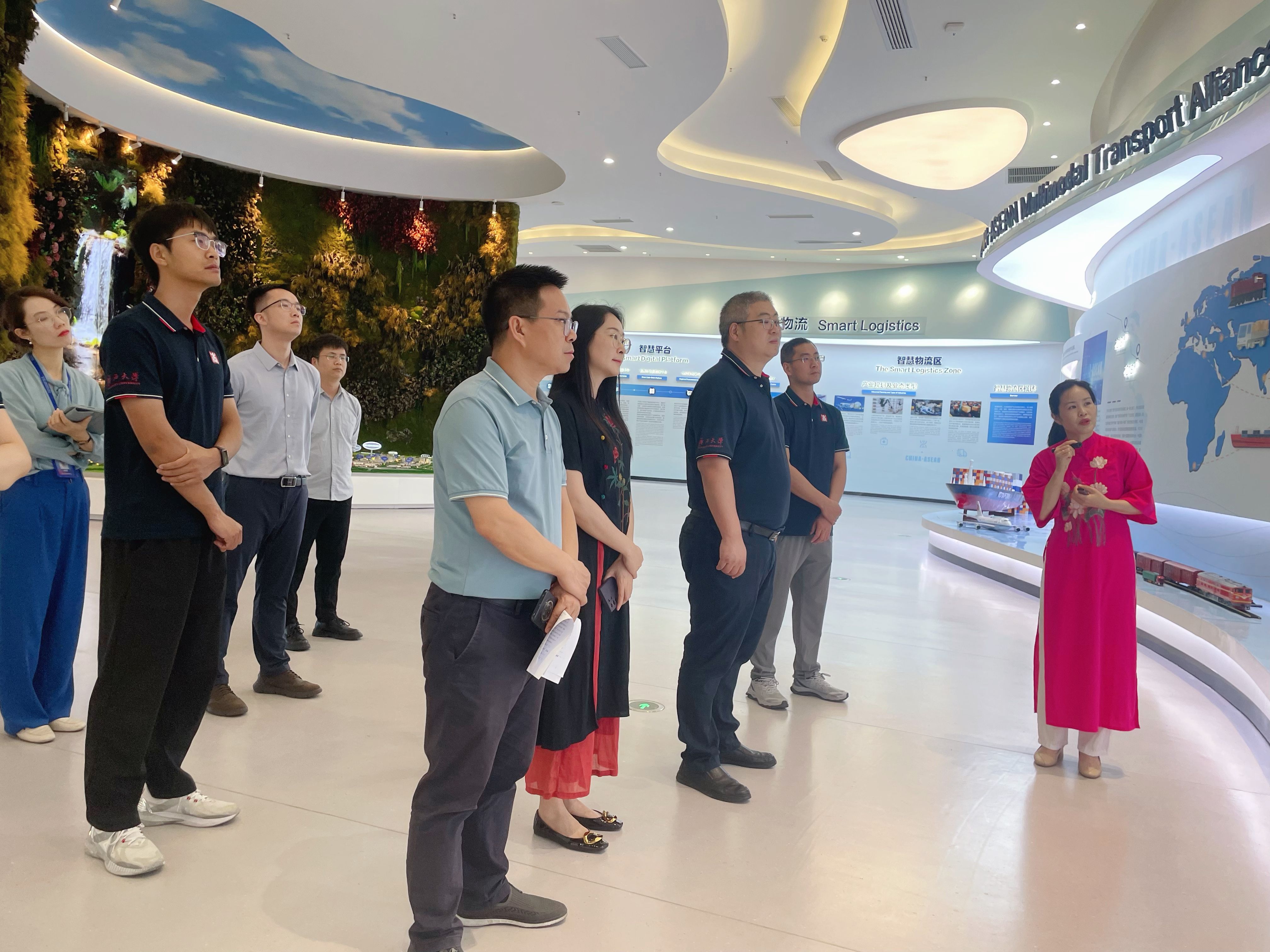 在中国—东盟特色商品汇聚中心副总经理李丹、活动策划部总经理刘金生等陪同下,调研组先后参观了中新南宁国际物流园展厅、汇聚中心新加坡馆、马来西亚、越南、印尼、泰国、缅甸等国家特色展馆及中国—东盟水果交易中心展厅,了解其在促进中国-东盟商贸互通中的枢纽作用。座谈会上,广西新中产业投资有限公司、中国—东盟特色商品汇聚中心董事长赵海燕提出企业人才需求及东盟商贸培训合作意向,双方就共建创新创业基地达成共识。朱帮助表示,学院将结合东盟区域经济特色,联合企业开发定制化课程,为跨境物流与商贸领域培养高素质复合型人才。