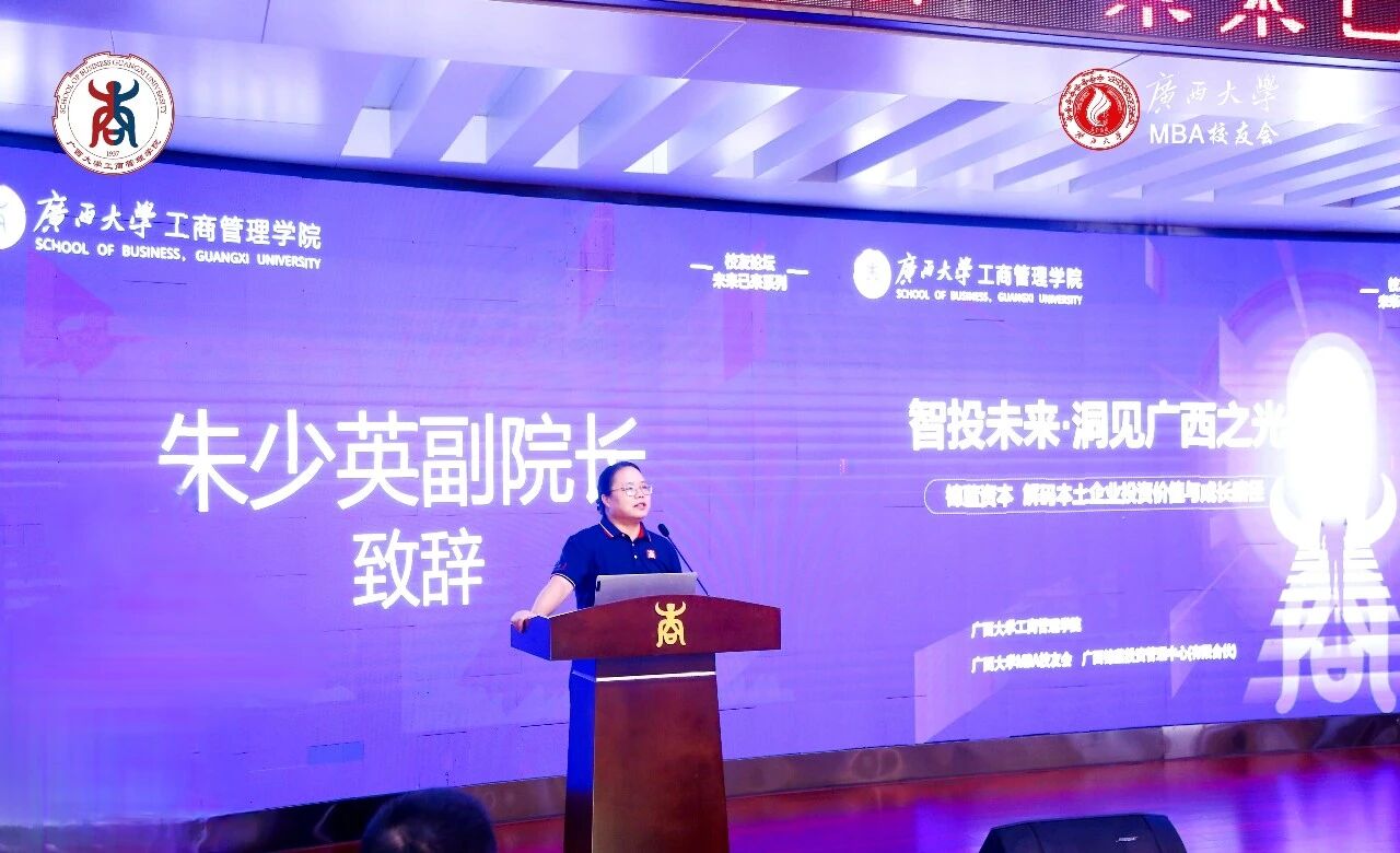 副院长朱少英致开幕辞。她提到,当前市场不确定性已成常态,企业家不仅需在战术层面积极应对短期挑战,更需具备战略层面的长远洞察与格局视野。“本次论坛既是思想碰撞的平台,更是挖掘‘广西之光’潜力的契机。” 朱少英副院长表示,期待校友们能从交流中 “听出趋势、看懂逻辑、学到方法、感受信心”,以共识凝聚力量,以协作共创未来。