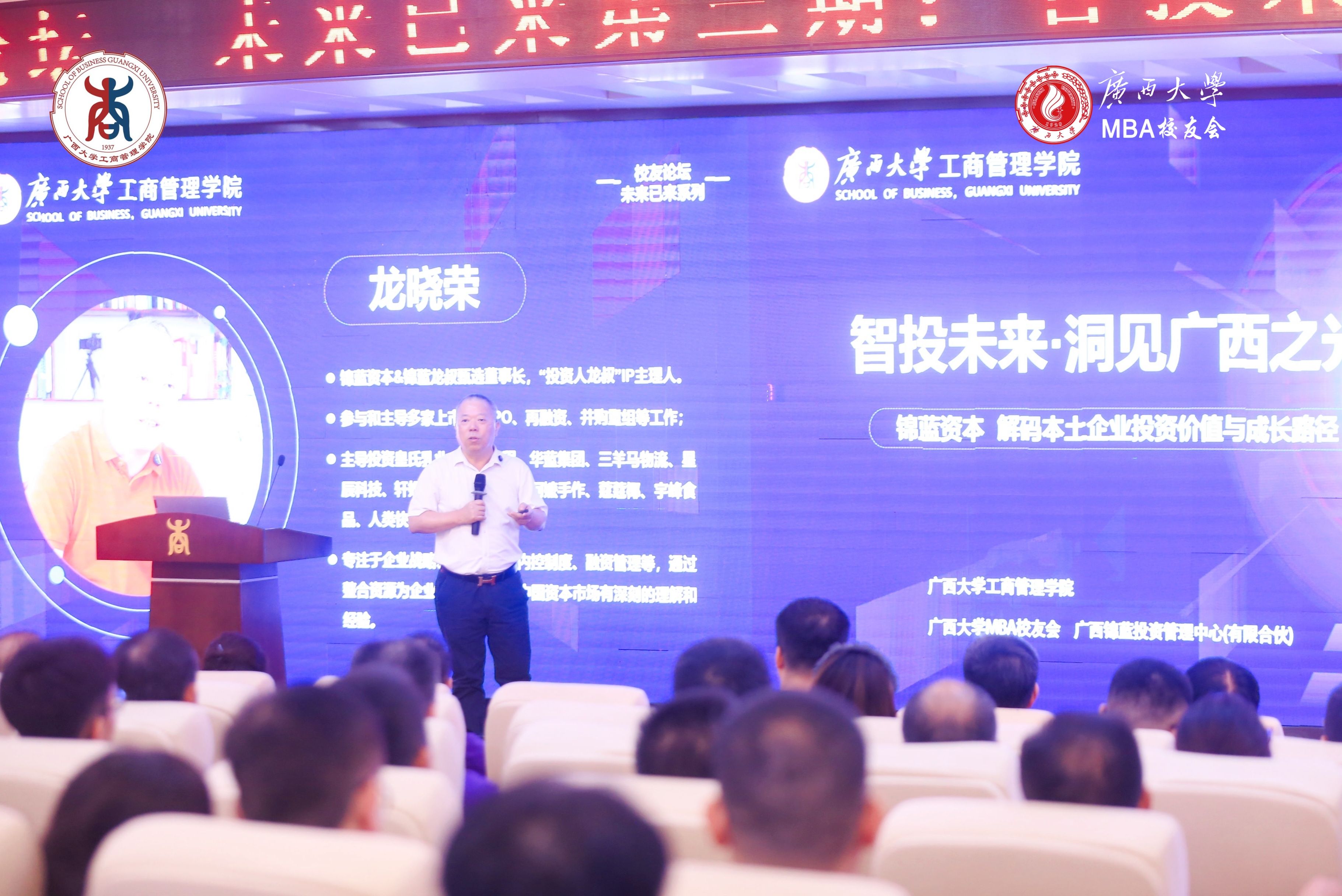MBA校友会联合主办的“未来已来”校友论坛第三期——“智投未来・洞见广西之光”,特邀锦蓝资本创始人、“投资人龙叔”IP主理人龙晓荣先生担任主讲嘉宾,与学院师生及校友共探发展机遇。