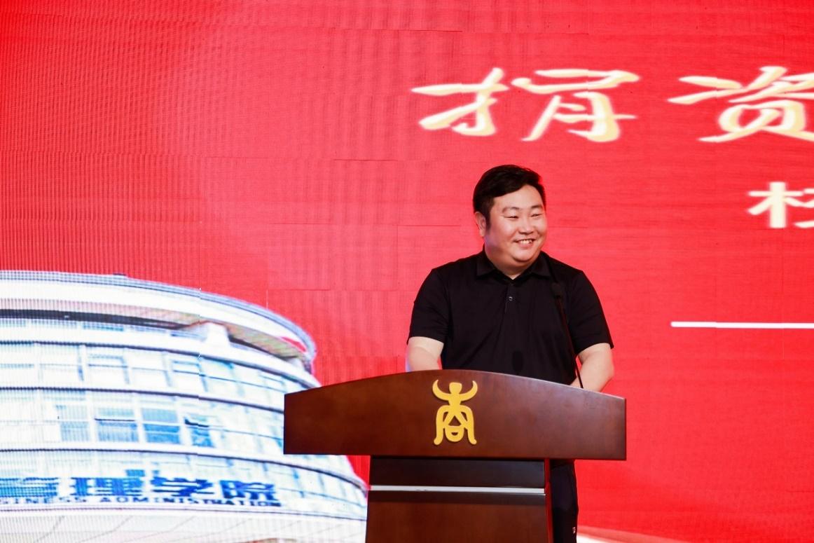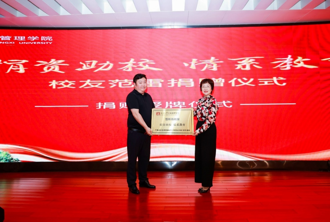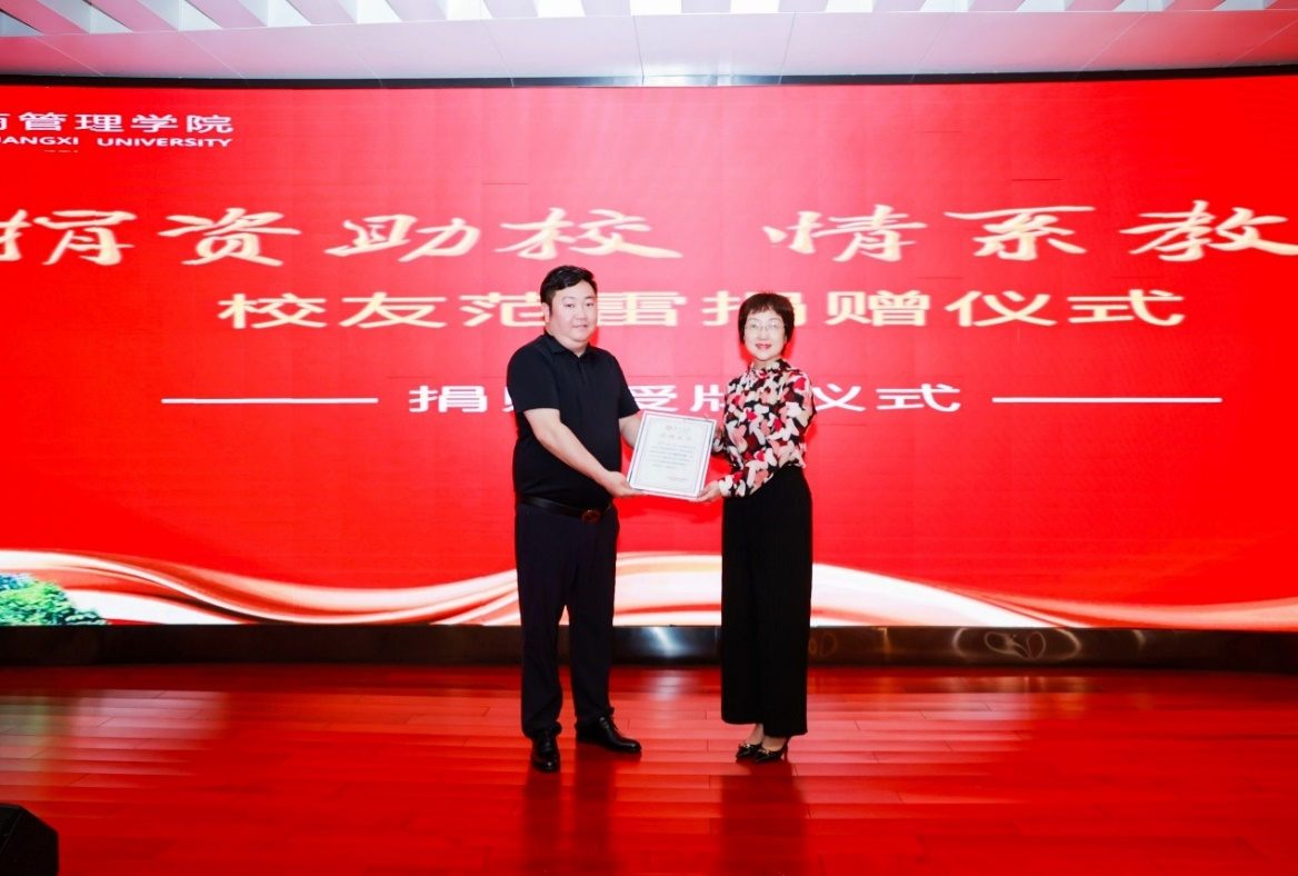 廖东红副院长为范雷校友授予牌匾并颁发证书。牌匾上“捐资助校,情系教育”八个字是对范雷校友此次捐赠最好的阐释,充分彰显了范雷校友深厚的爱校情怀和高度的荣校担当。