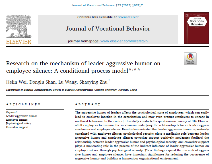 韦荷琳博士为第一作者、朱少英副教授为通讯作者、硕士生山冬鲁和本科生王璐为共同作者,在国际知名期刊《Journal of Vocational Behavior》发表学术论文“Research on the mechanism of leader aggressive humor on employee silence: A conditional process model”。