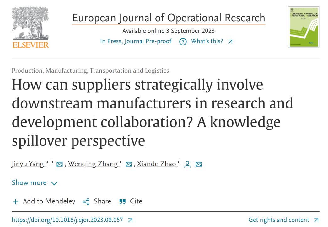 青年教师阳瑾瑜以第一作者在国际知名期刊《European Journal of Operational Research》在线发表学术论文《How can suppliers strategically involve downstream manufacturers in research and development collaboration? A knowledge spillover perspective》。该期刊2022年影响因子为6.4,为JCR SCI一区、ABS/AJG四星期刊。该期刊致力于发表高质量的原创论文,为运筹学(Operational Research)方法论和决策实践做出贡献,主要刊载的研究主题有:连续优化、离散优化、生产、制造和物流、随机与统计、决策支持、计算智能与信息管理等。