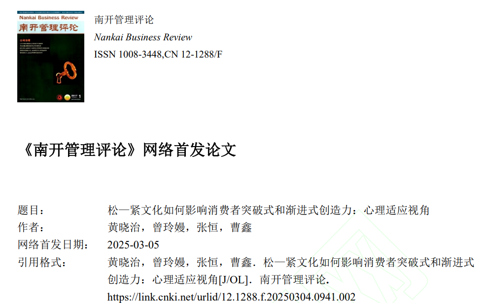 企业管理系黄晓治教授及其研究团队的研究成果《松—紧文化如何影响消费者突破式和渐进式创造力:心理适应视角》在管理学中文权威期刊《南开管理评论》网络首发。黄晓治为论文第一作者,H动画