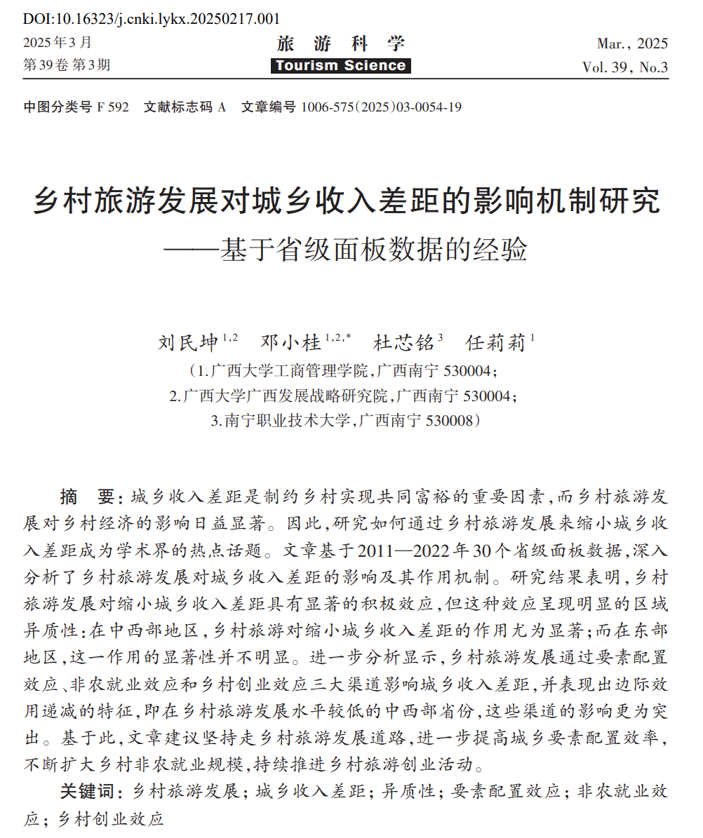 刘民坤教授科研团队在乡村旅游与城乡发展领域取得新进展,研究成果以《乡村旅游发展对城乡收入差距的影响机制研究——基于省级面板数据的经验》为题,在旅游管理领域高水平期刊《旅游科学》2025年第3期发表。刘民坤教授为第一作者,邓小桂、杜芯铭、任莉莉等共同参与研究,H动画