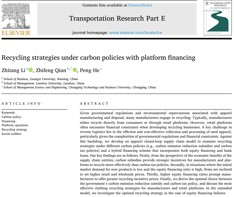 引用格式:Zhitang Li, Zhifeng Qian,Peng He. (2026). Recycling strategies under carbon policies with platform financing. Transportation Research Part E-Logistics and Transportation Review, 209, 104735.