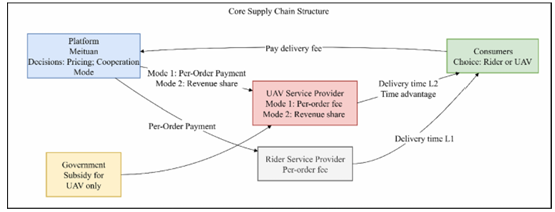 低空经济的兴起与无人机技术的快速发展,凸显了基于无人机的配送的战略作用。该研究探讨了以美团等平台主导、骑手与无人机服务商构成的两层外卖供应链。结果表明:无人机技术价值越高,虽会增加骑手单量与费用,但初期会抑制无人机订单,直至其时间优势凸显。政府补贴能增强无人机竞争力、提升各方利润。在合作模式上,技术价值高时,平台与无人机供应商宜采用“收益分享+补贴”;价值中等或时间差极大时,“按单付费+补贴”更优。骑手可在技术价值高但时间优势有限时差异化竞争,或在价值中等时合作;无人机供应商则根据技术与补贴条件选择合作模式;平台作为协调者,动态选择最优模式以平衡风险与收益。