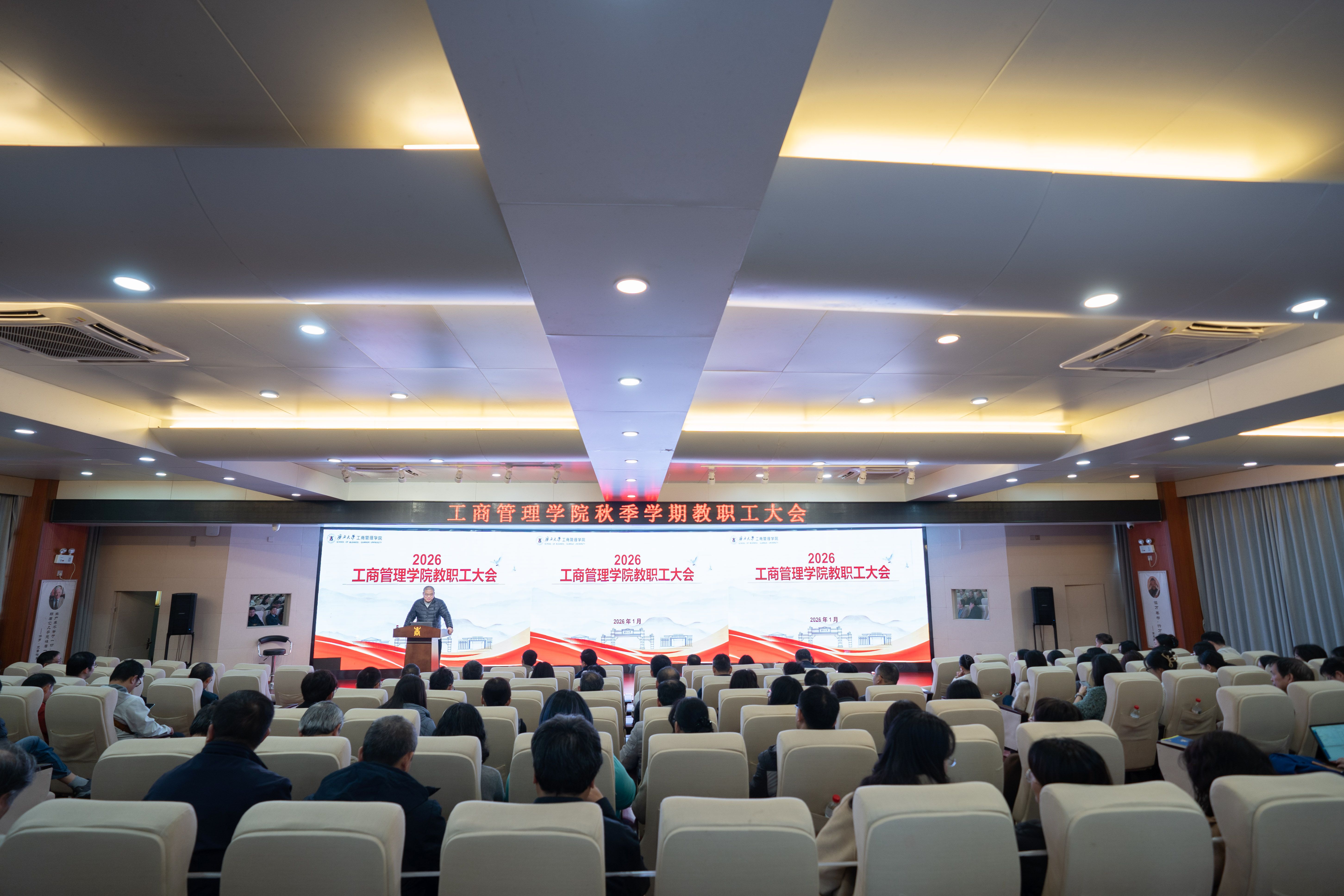 1月13日下午,H动画 在128报告厅召开期末教职工大会,全面总结2025年发展成效,系统部署2026年重点工作。学院党委书记黄晋、院长朱帮助、党委副书记肖克宁,副院长申韬、廖东红、韦铁,院长助理蒋侃出席会议,全体教职工参加了会议。 -