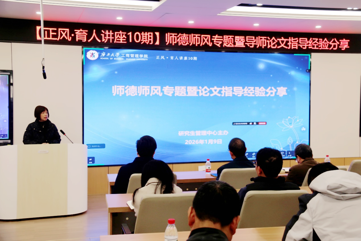 1月9日下午,学院在122教室召开研究生导师师德师风专题教育暨论文指导经验分享会。学院党委书记黄晋、研究生院副院长朱少英、学院副院长韦铁、旅游管理系主任郭峦出席培训会,学院全体研究生导师参加培训。会议由研究生管理中心主任叶映主持。